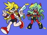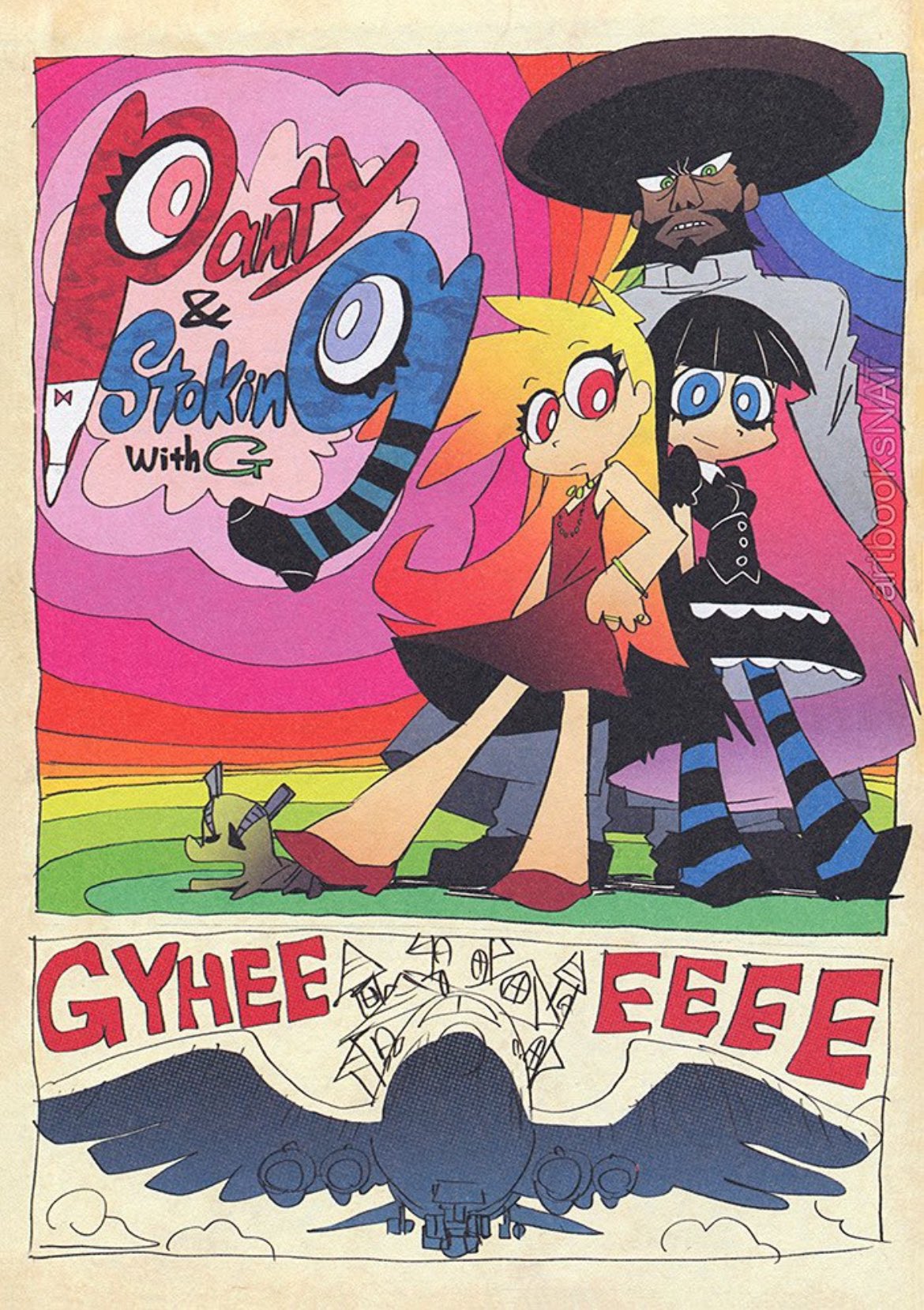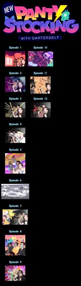 Kneesocks Football, Stocking Angry in the Donald Duck like outfit. Brief Holding Panty's hand, Closeup shot of panty running through a crowd with a blue ribbon, Panty in a red dress under spotlights, Scanty Transforming her gun into a shotgun, Scanty with sunglasses fighting while standing on a pile of ghosts, Stocking being shot in the head, angel twinks, Angels and Demon silhouettes on the runway sorta thing