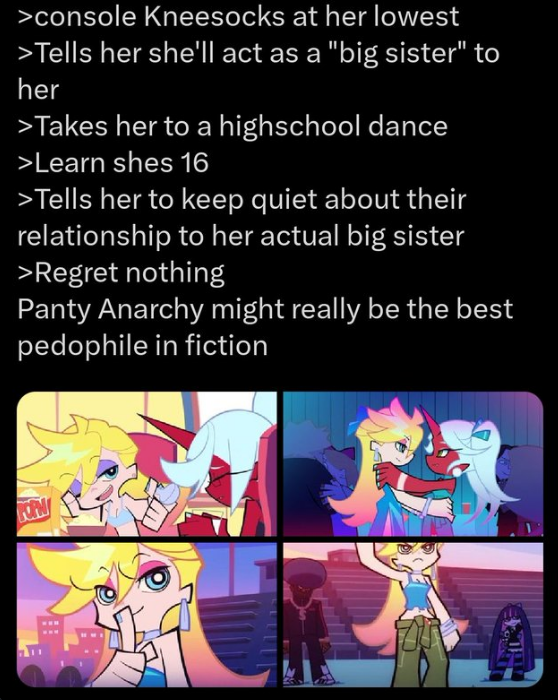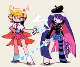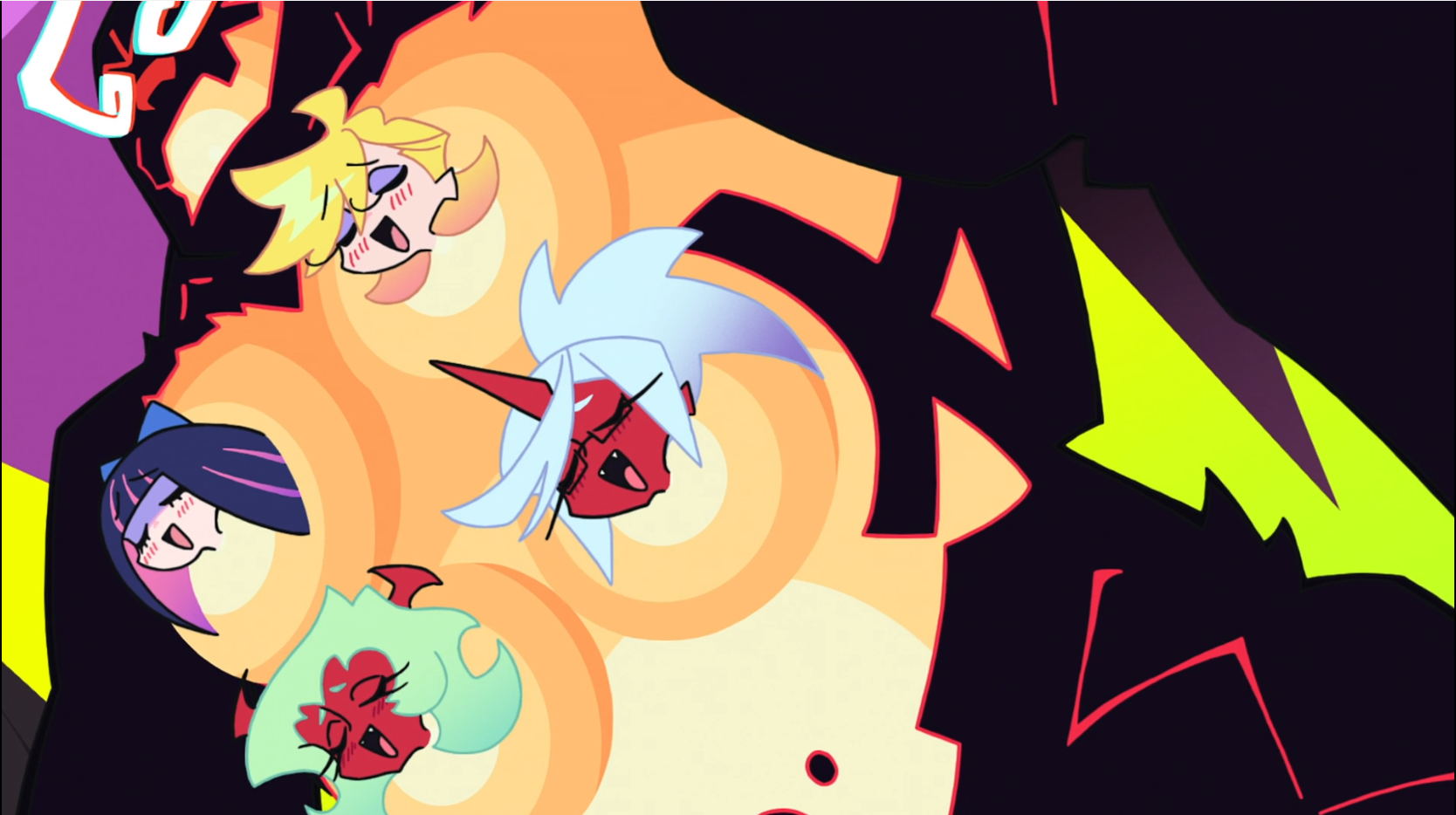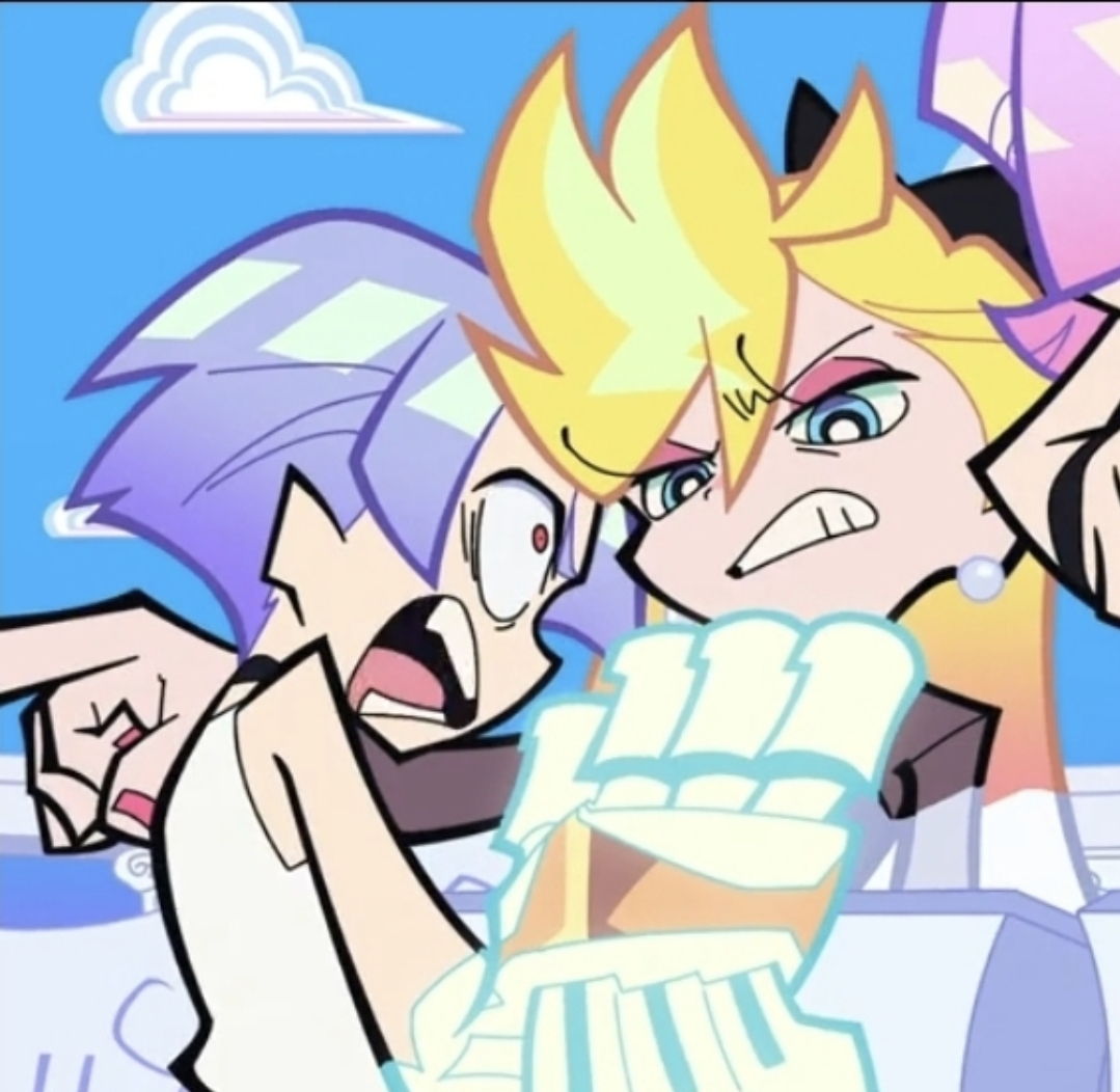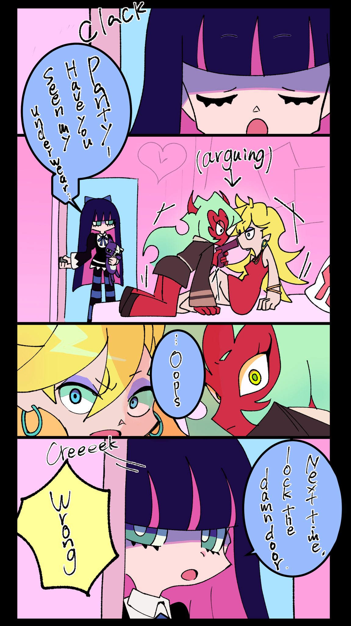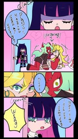 As for the overall relationship, they fuck with each other to piss the other off, and it pisses them off that they found the other attractive for an angel/demon, so the shenanigans escalate because of that. They will fuck themselves over if it means getting the other one pissed. Kneesocks and Polyester are basically the voice of reason. For once, Panty and Stocking are the ones providing commentary.