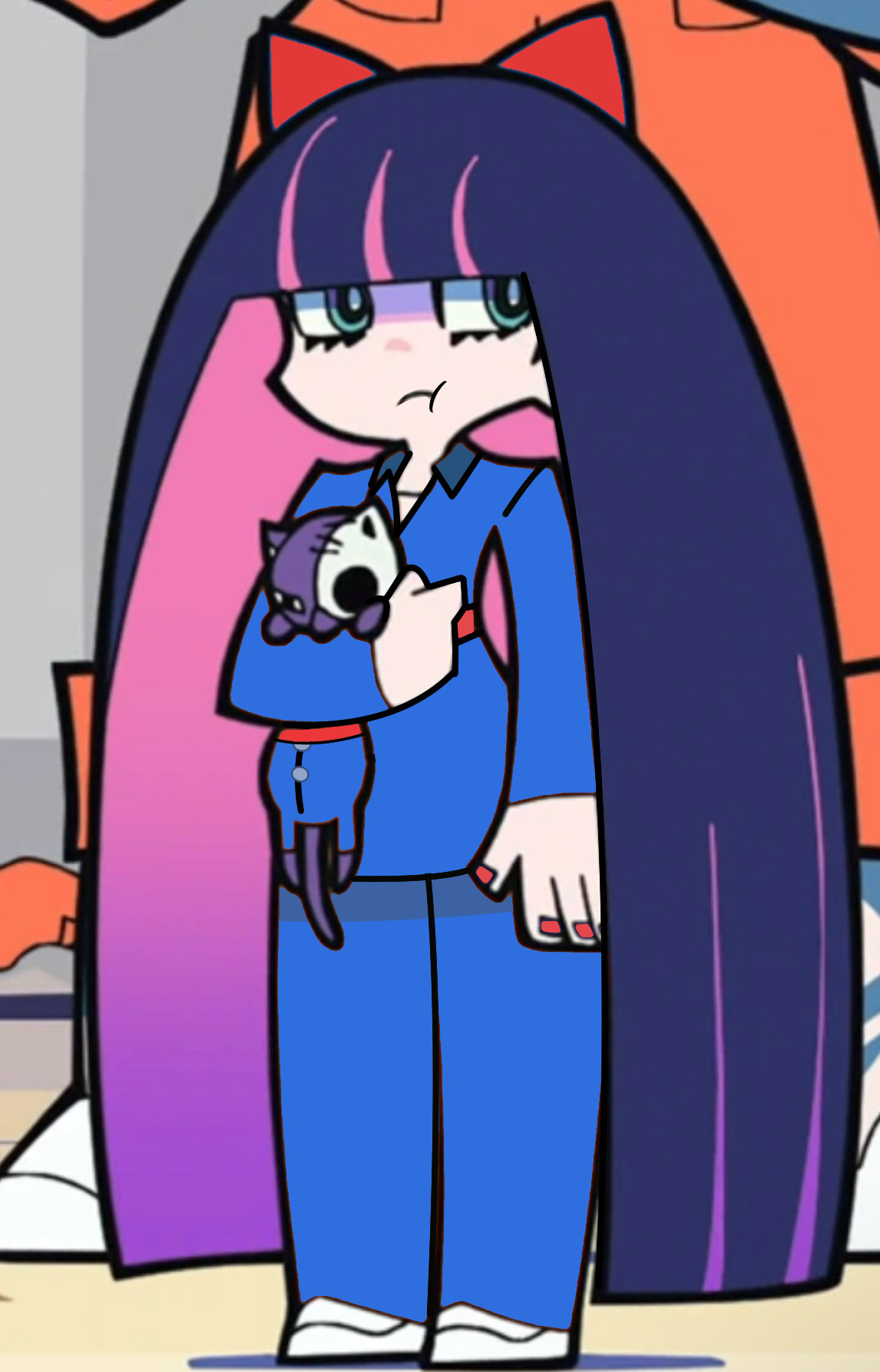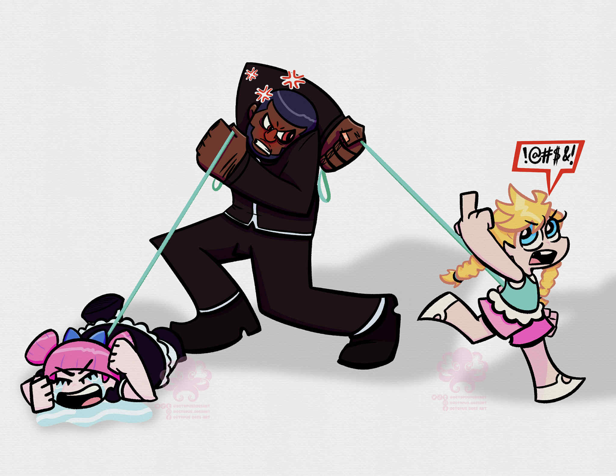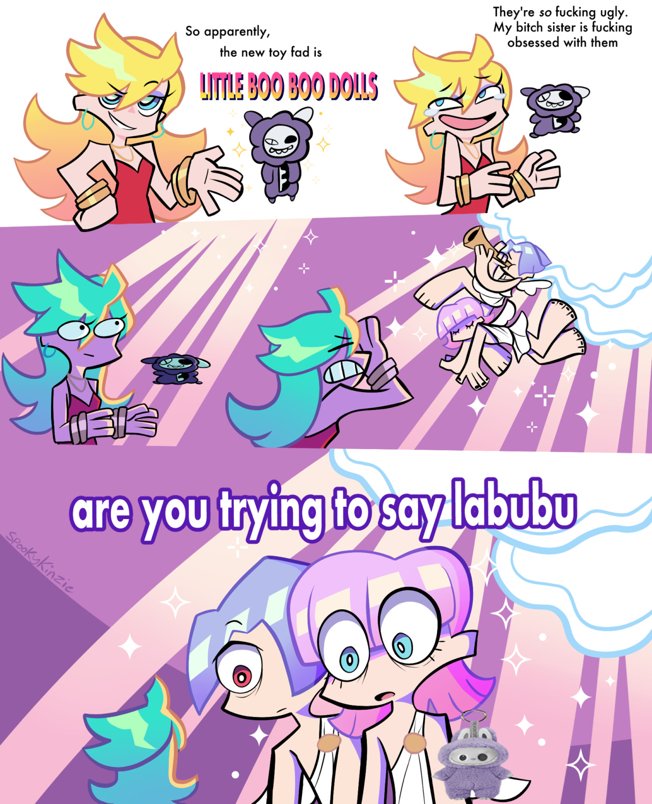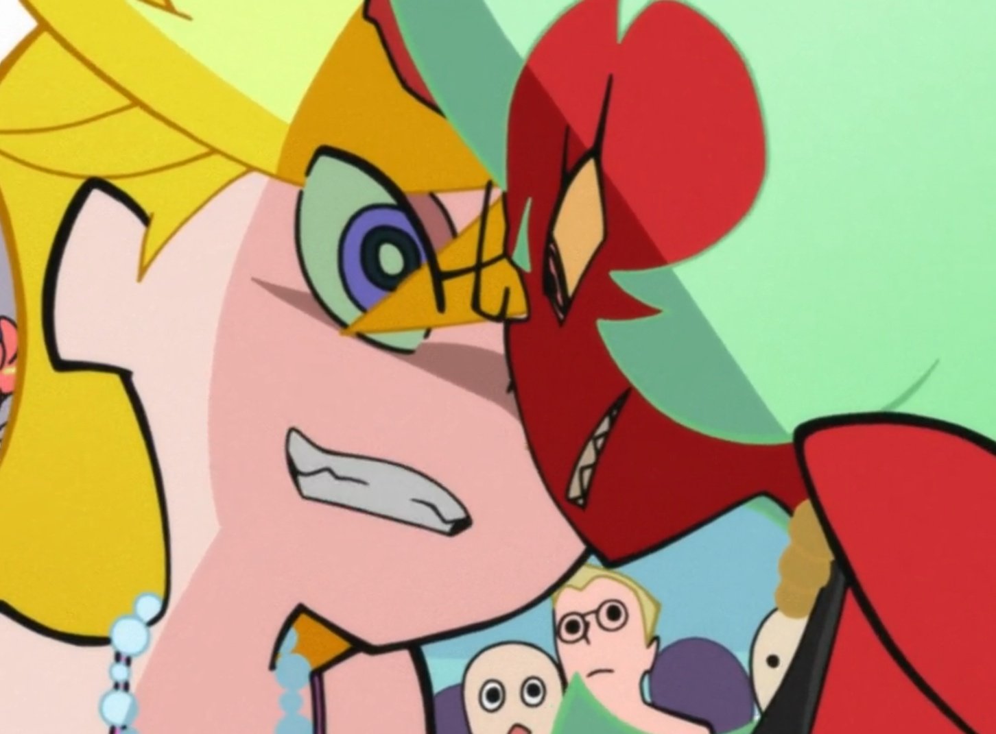 As for the overall relationship, they fuck with each other to piss the other off, and it pisses them off that they found the other attractive for an angel/demon, so the shenanigans escalate because of that. They will fuck themselves over if it means getting the other one pissed. Kneesocks and Polyester are basically the voice of reason. For once, Panty and Stocking are the ones providing commentary.