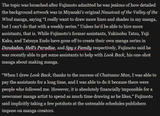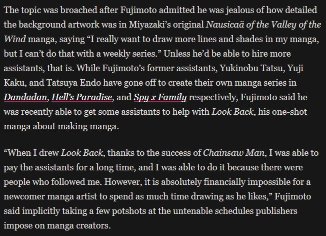 >Tatsuki Fujimoto: "All mangaka wanted to do this job because they love sharing stories and drawing, but when you actually become a mangaka, you realize you need to handle everything alone. When working for weekly magazine, you just don't have enough time. The schedule is too intense, and you need to work as fast as possible. I always end up improvising some things during the inking phase to save time. I'd like to do both the characters and backgrounds myself, but this is so difficult I need to ask my assistants to handle the backgrounds".