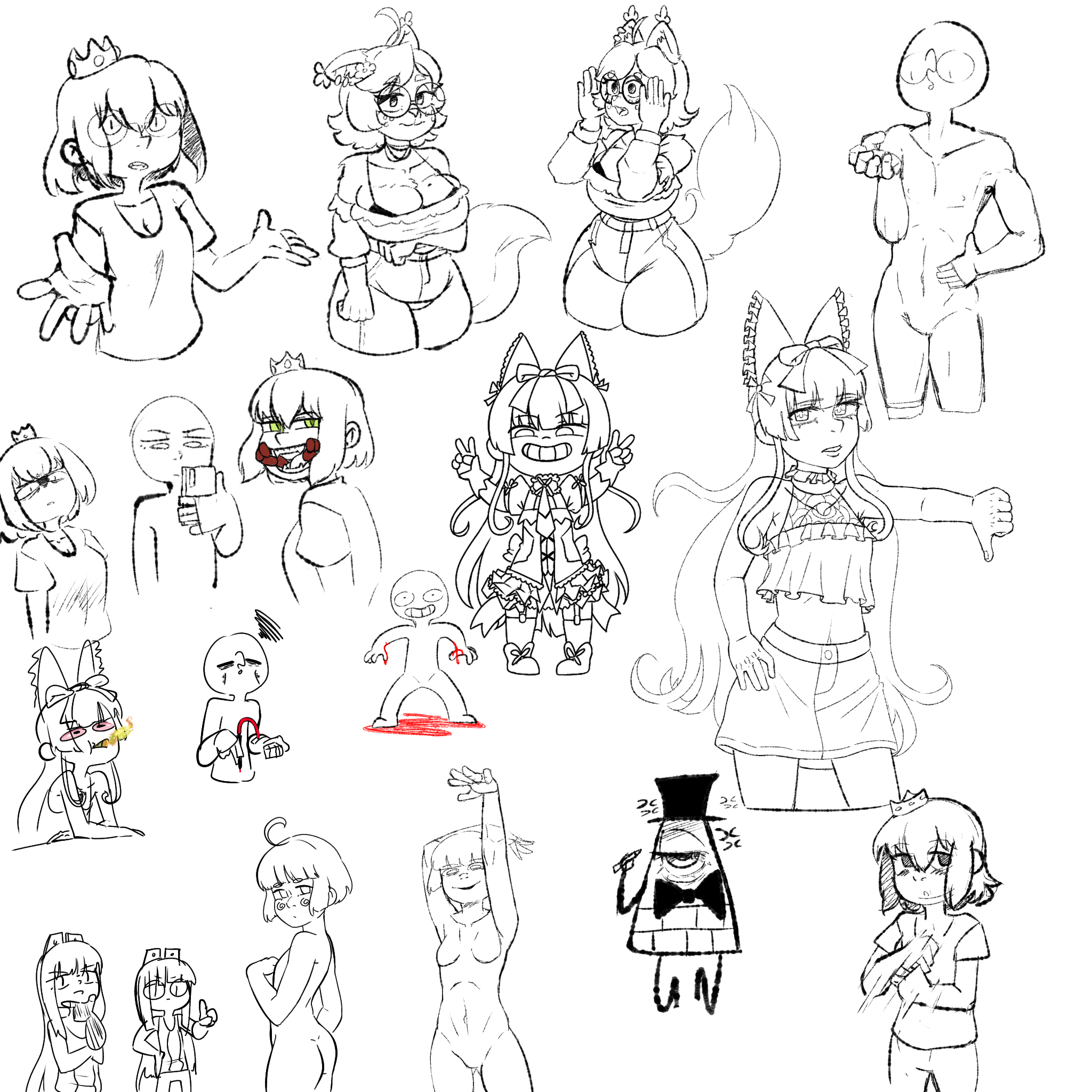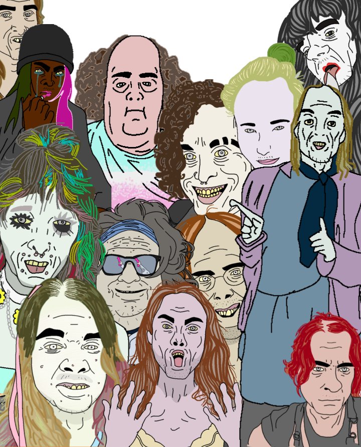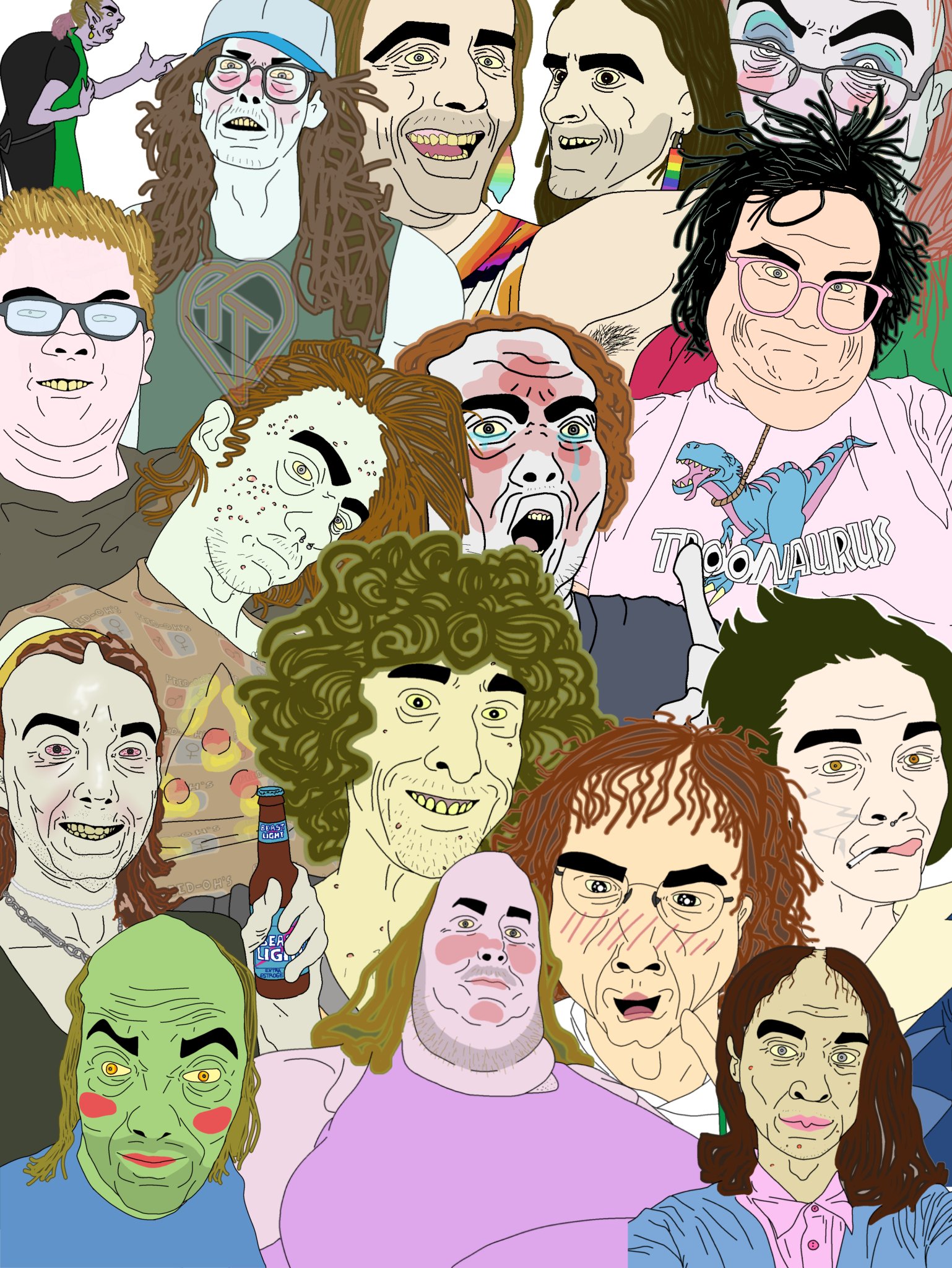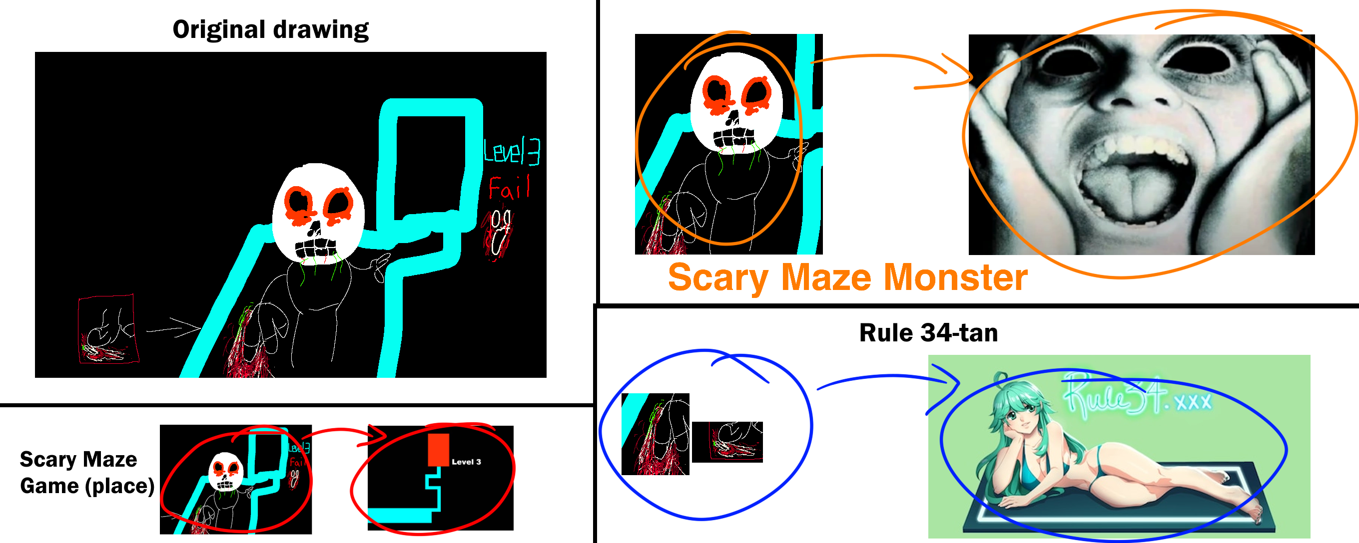 Bottom right: Rule 34-tan (mascot of Rule34.xxx) being mutilated (via crushed) by Scary Maze monster