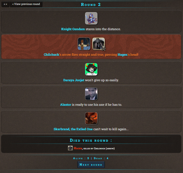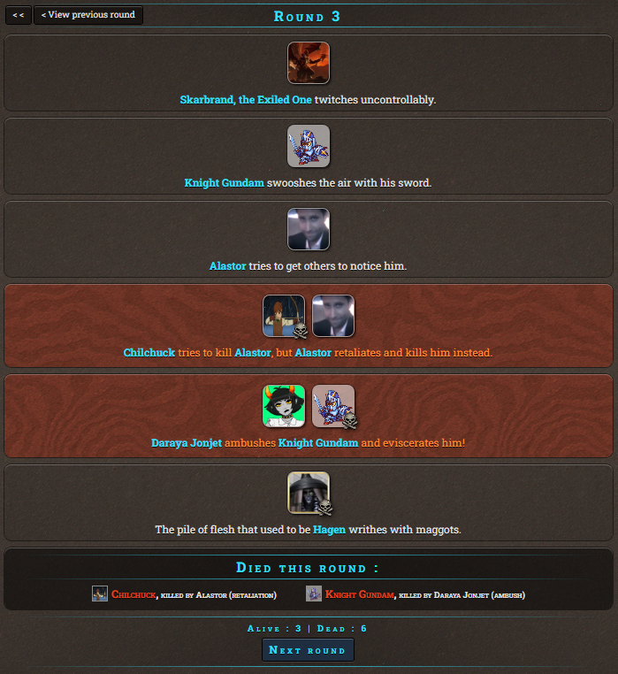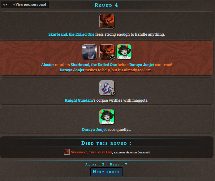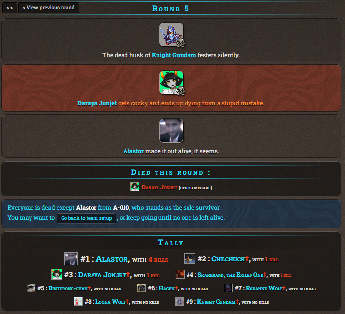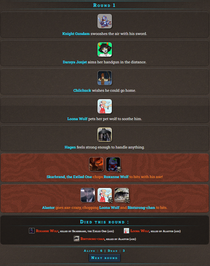 It's late to the point it's early so time for Murder Games! Remember things are a little different from normal HG threads, instead of the regular sim we'll be using the Murder Games sim, meaning there is a time limit to enter rather than a need to fill 24 slots. So I'll take in any tribute for the next 25 minutes.