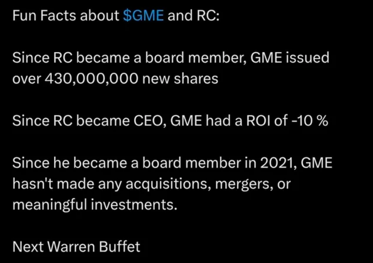 I assume RC is already prepping legal action due to his own broker mishandling the corporate actions he approved. I wonder if he will mention anything in his media appearance, or will focus on the business side of gamestop.