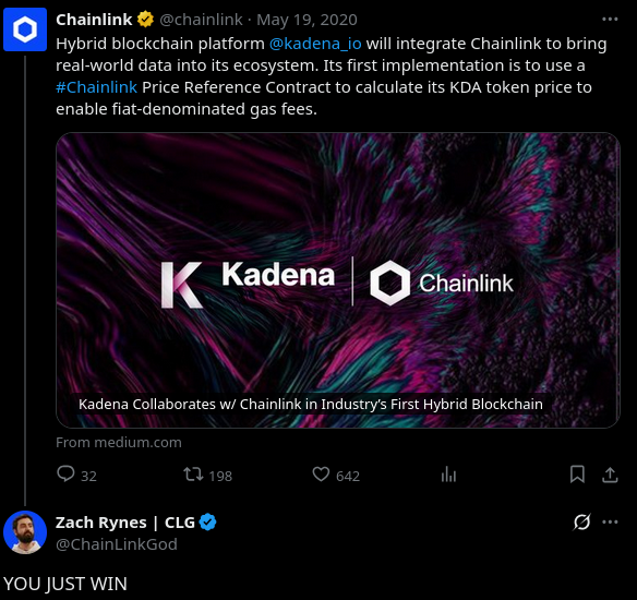 "Kadena themselves can't even release a functional multichain dapp. Data segregation between chains is painful. The complexity of using more than one chain is insane. Try to make something as simple as an oracle, you either serve only one chain or you spam the same data 20 times."