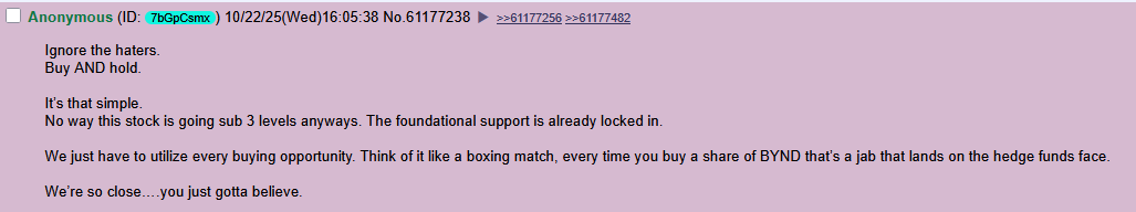 The hedgies think they can keep roadblocking us. The institutions think a few circuit breakers are going to deter the BYNDMARINES? Theyβre nuts! We will never sell!β