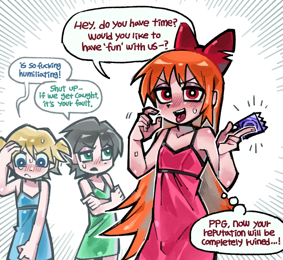 Gigles sound incredibly closer to you door. Your door opens without any knocking. All the girls cross into your doorstep not bothering about your permission. They don't care wether you agree or not because you are no longer a human to them, you are now a toy, and more than that you are a game.