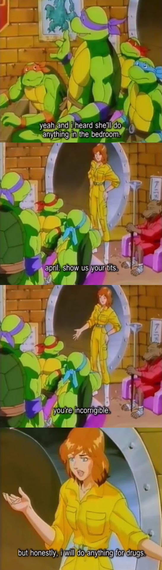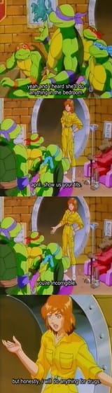 Thats it. The first few waves of toys had an april figure, and they attempted to make her similar to barbie and she ra. The basic idea was to have a figure that girls could join in with their male friends or siblings to play ninja turtles with. At worst, a working woman that wouldn't be insulting and annoying to a mother or grandmother who would probably purchase the toys.