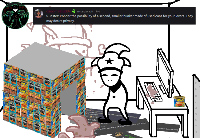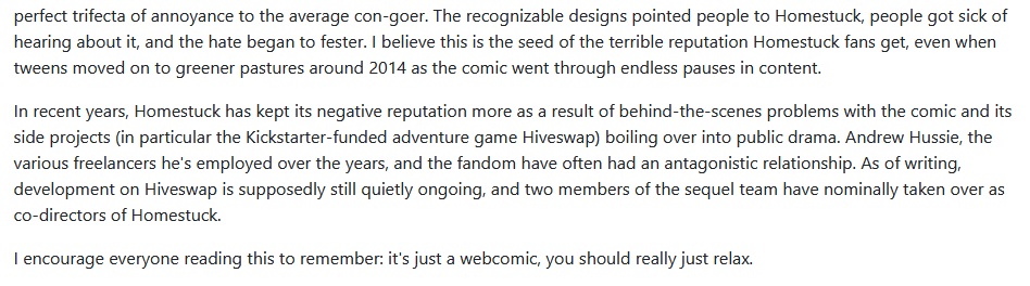 It is kind of hilarious how Hussie is capable of effortlessly mogging the HS:BC team's ability to scramble together some stupid user-suggested "rub character against various objects in room" pages. He did 18 in one day with more on the way in Jester Quest while the Beyond Canon team can hardly scrounge together 10 in a week with way more people working on the project, and being paid to do it. Surely it must be a situation of there just being too many cooks in the kitchen. It's not even like the art is crazy good or anything, and only a few pages had bespoke artwork.