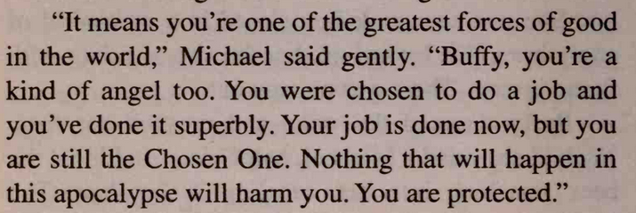 >Buffy in the novels is explicitly said by an angel to be holy