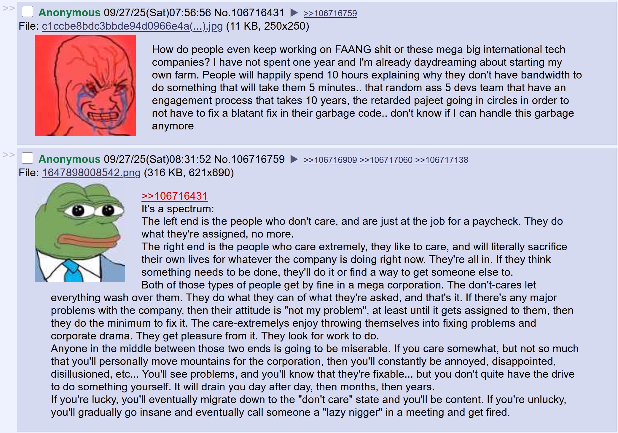 i mean tbf i'd really like just a work culture general. there's too much fucking lookism/racism/sexism shitposting in this damn general