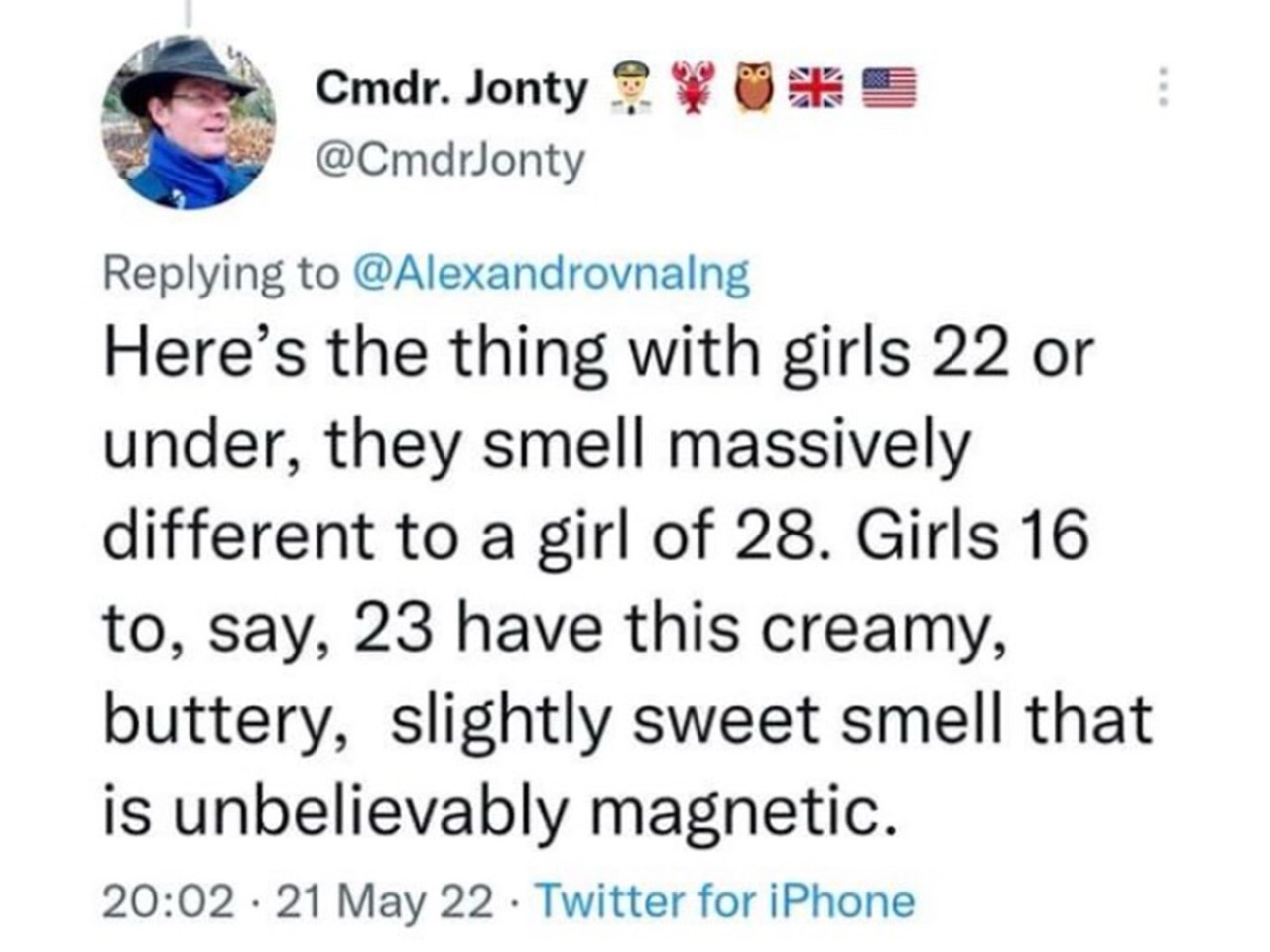 >claims to have had lots of sex with many women decades ago until something "drastically changed in the dating scene" (all its hair fell out at once in clumps, precipitating a mental breakdown) so it was forced to turn to this life of vigilante autistic ritual posting