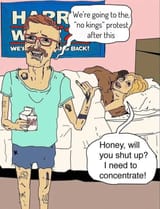 Dadberg doesn't want to go to the protest today. Going to a rummage sale instead