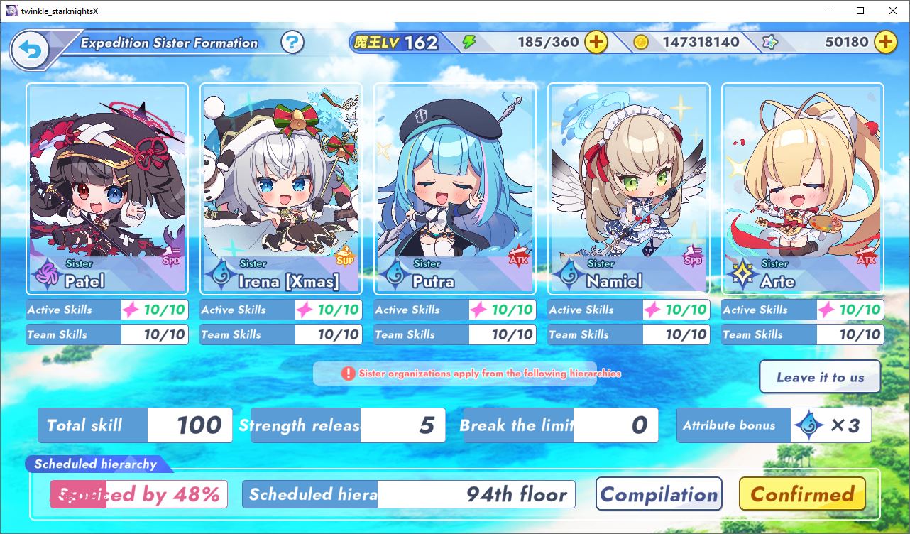 Past that, the basic team structure is CT reduction, a bunch of buffers/debuffers usually including a healer, and then 1 meaty DPS. Hard content is basically looping your team infinitely while the enemy never gets a turn until you're buffed so much your DPS nukes the enemy the moment they unleash their skill. It's very much a team building game. And for basic starters, you need 8 teams. 5 elemental, 3 race. That's just the start, there's mixed element, race+element, faction, weapon type, etc.