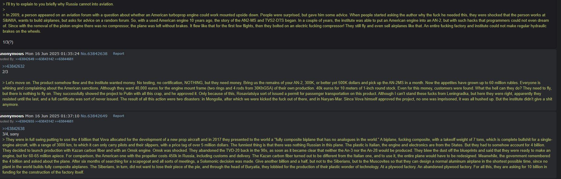 So yeah, instead of cloning the old plane with some modern improvements, which should've been easy and straight forward, and concentrating on actual production, setting up servicing for the planes and so on they've spent most of their resources on trying to create a "cool modern ANALOGOVNET" shitbox, with composite and shit. Stumbled and fumbled every step possible. For example, the R&D faggots using foreign composites, while the actual manufacturers being forced to use domestic composites, which SURPRISE-SURPRISE sucked ass and didn't have the necessary characteristics, resulting the plane breaking under basic load. Why do you even need composites for a fuckin' "cheap flying minivan" (that's what an AN-2 is)? Because it's cool, modern and ANALOGOVNET.