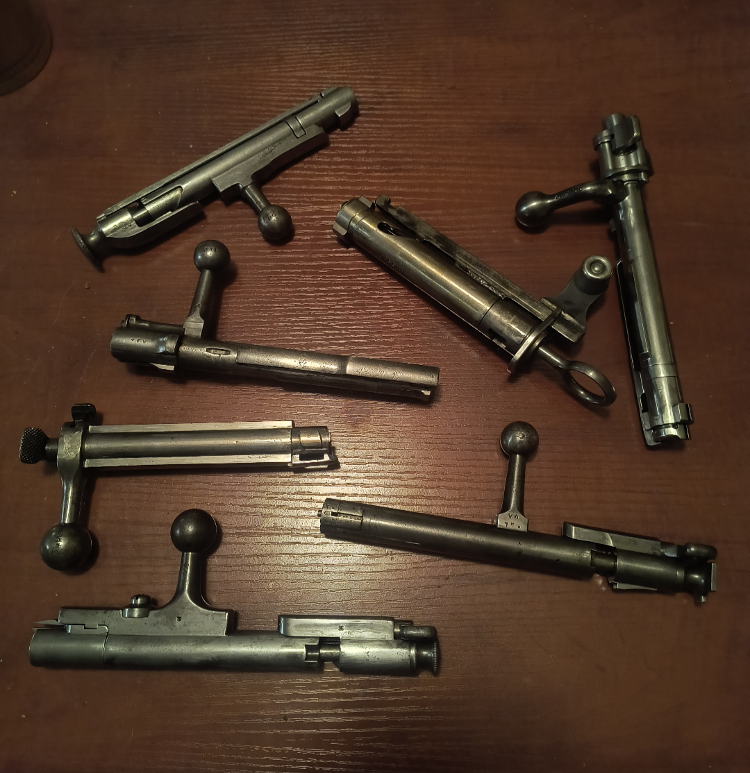 mosin, pre 98 mauser bolt (1895?), k31, 98 mauser bolt, Mannlicher, carcano bolt (?), and whats that one on the bottom right?