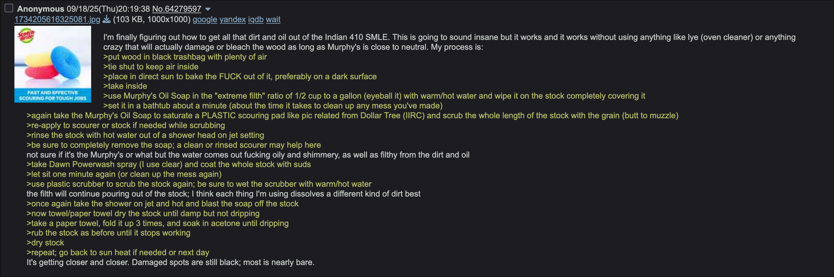 For the anon, who was cleaning his lee Enfield with murphy's oil cleaner, how many times did you ended up putting it on the wood? After drying, I still have tiny left over dirt inside the section where the receiver goes, not sure if it's worth going back and hitting with cleaner again to get it out.