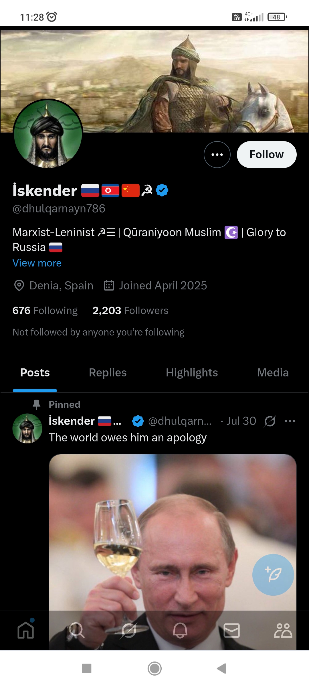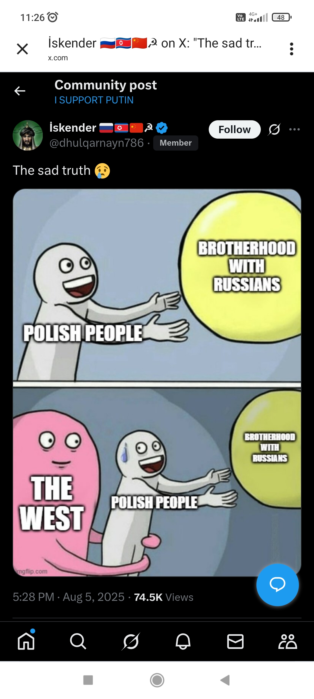 The White Nationalist variant is the easiest to break. He'll post "replacement" memes while cheering for a multi-ethnic horde that's slaughtering white Slavs and importing Central Asians to replace them. Force him to explain the contradiction. He will seethe and deflect.