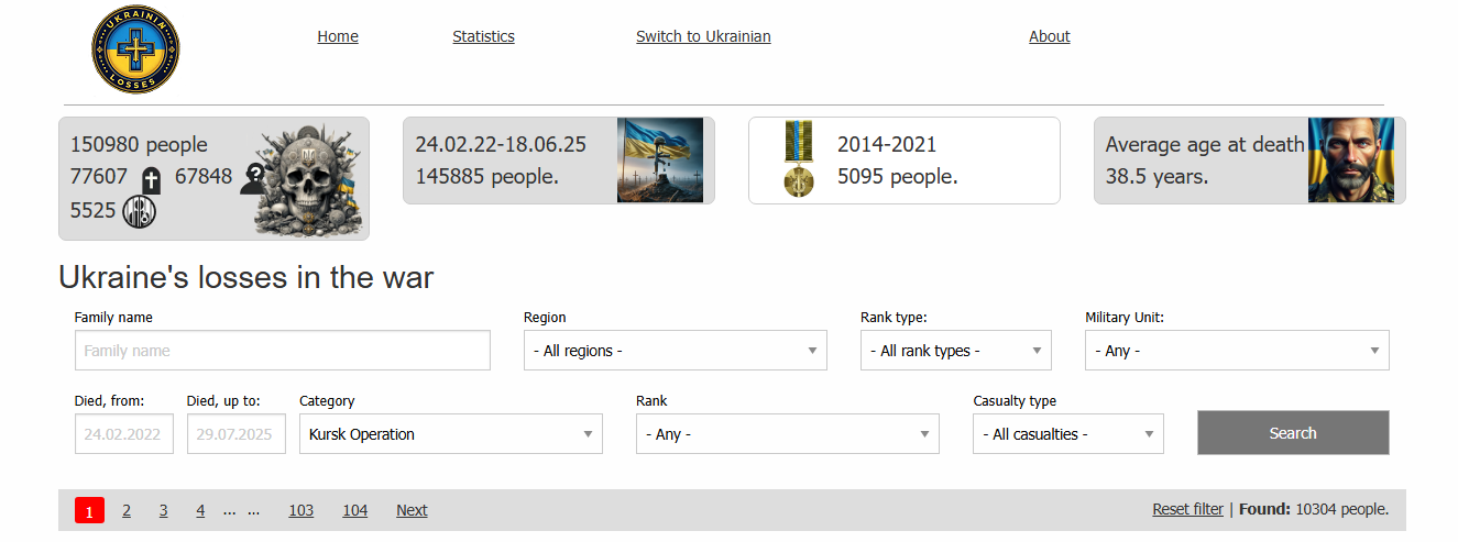 In Kursk Ukraine has 10,304 dead, 7,690 are listed as MIA and 2,307 are listed as KIA for a 3.24:1 ratio of MIA to KIA.
