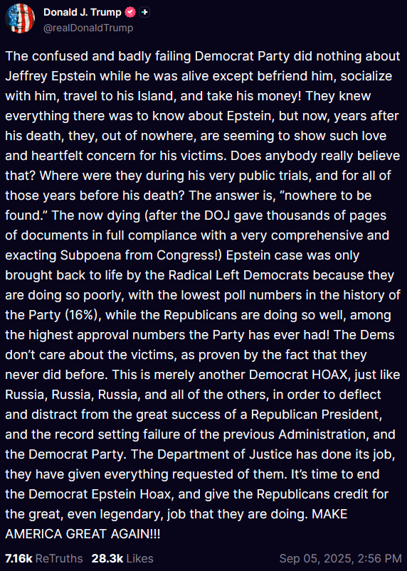 The confused and badly failing Democrat Party did nothing about Jeffrey Epstein while he was alive except befriend him, socialize with him, travel to his Island, and take his money! They knew everything there was to know about Epstein, but now, years after his death, they, out of nowhere, are seeming to show such love and heartfelt concern for his victims. Does anybody really believe that? Where were they during his very public trials, and for all of those years before his death? The answer is, “nowhere to be found.” The now dying (after the DOJ gave thousands of pages of documents in full compliance with a very comprehensive and exacting Subpoena from Congress!) Epstein case was only brought back to life by the Radical Left Democrats because they are doing so poorly, with the lowest poll numbers in the history of the Party (16%), while the Republicans are doing so well, among the highest approval numbers the Party has ever had! The Dems don’t care about the victims, as proven by the fact that they never did before. This is merely another Democrat HOAX, just like Russia, Russia, Russia, and all of the others, in order to deflect and distract from the great success of a Republican President, and the record setting failure of the previous Administration, and the Democrat Party. The Department of Justice has done its job, they have given everything requested of them. It’s time to end the Democrat Epstein Hoax, and give the Republicans credit for the great, even legendary, job that they are doing. MAKE AMERICA GREAT AGAIN!!!