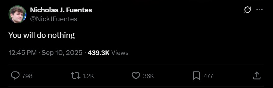the biggest mistake you can make on the internet is currying the favor or support of people who extol you for encouraging violence or vigilantism. if that is the reaction to your message on platforms like this, you are truly working against your own interests. sounds like Nick made a good show tonight based on the faux seethe occurring all over his threads