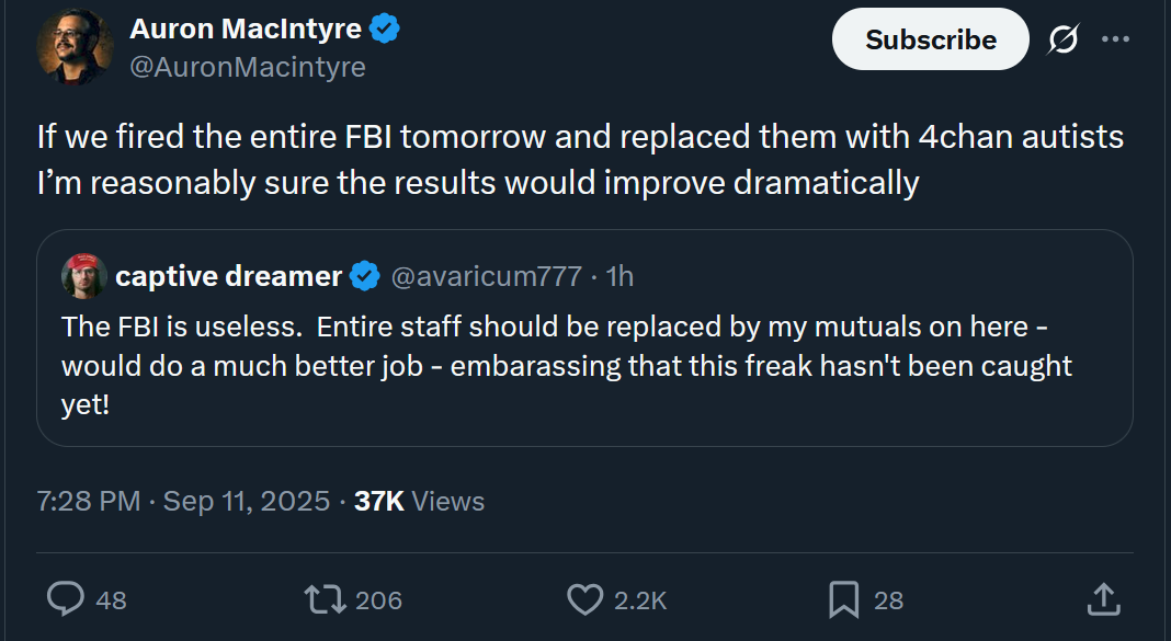 Give me criminal immunity, the full resources of the FBI, a massive salary, and a tasteful early 2000s dnb soundtrack and I will create a futurefash society we were meant to have