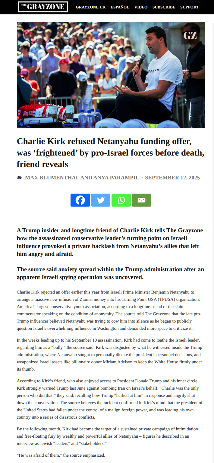 The Epstein files are my #1 priority. Furthermore, I want to note that Charlie Kirk was murdered by Israel for turning against them. Made an example of for others in US politics to know they can not rock this boat. Distracting us from the Epstein files, obviously, was also a primary motive in this attack