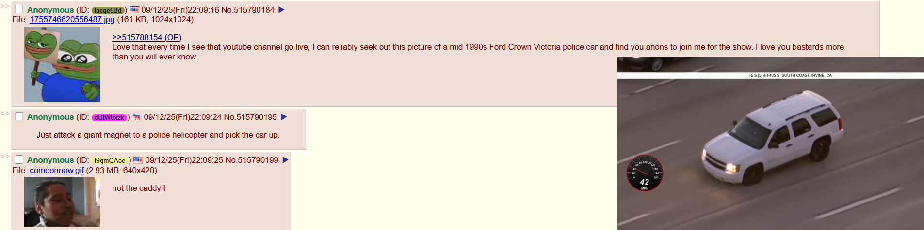 Love that every time I see that youtube channel go live, I can reliably seek out this picture of a mid 1990s Ford Crown Victoria police car and find you anons to join me for the show. I love you bastards more than you will ever know
