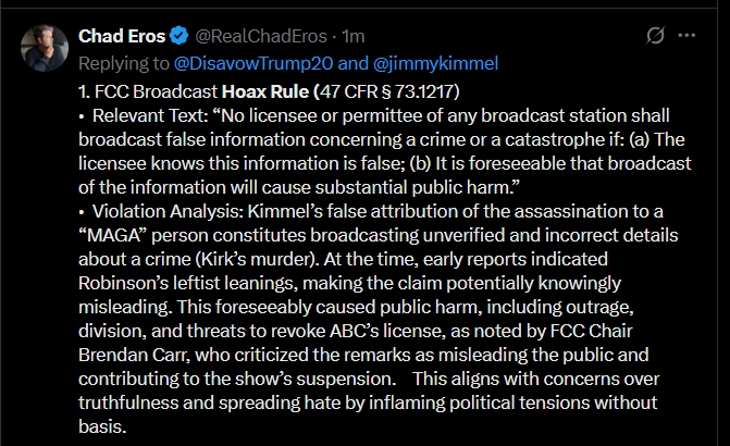 >Kimmel was reporting falsehoods as if they were true, in regards to a disaster, which is against FCC regulations.