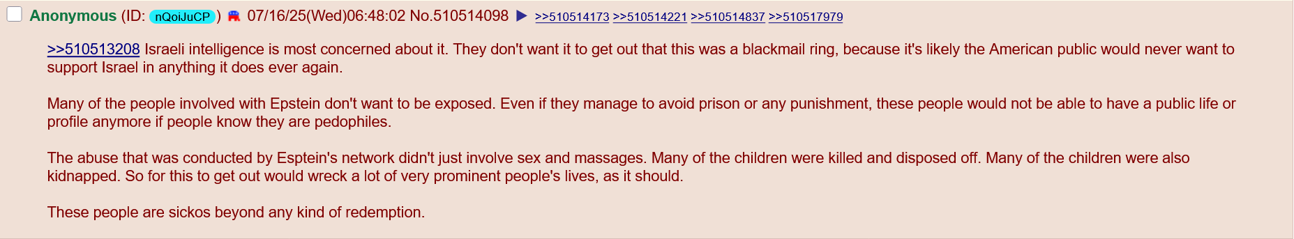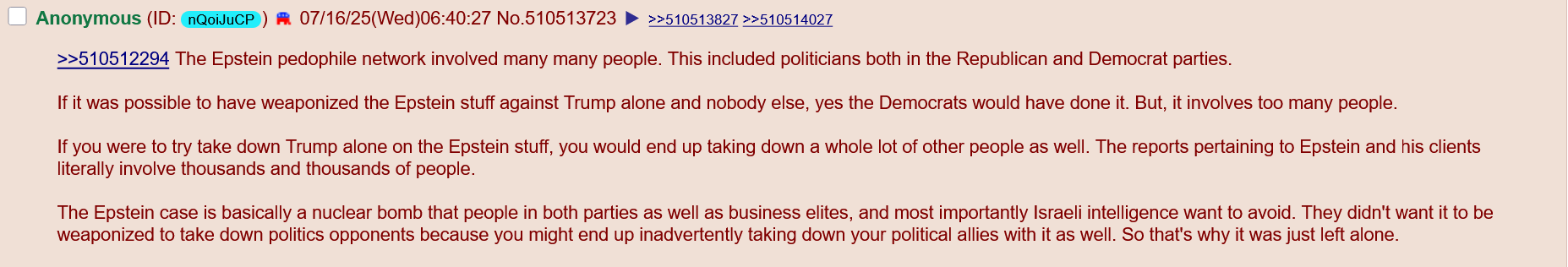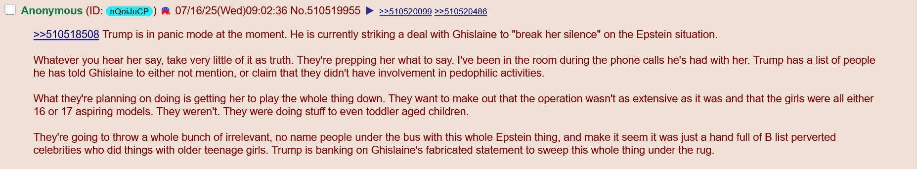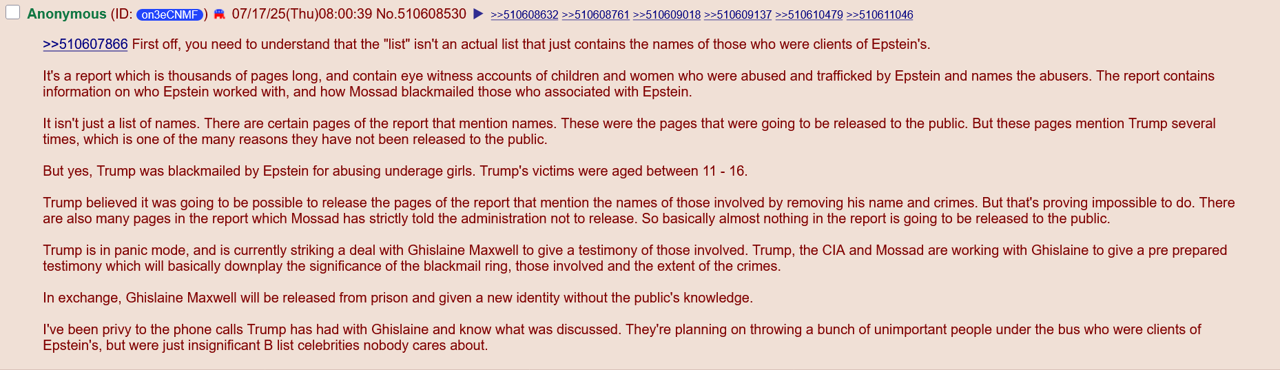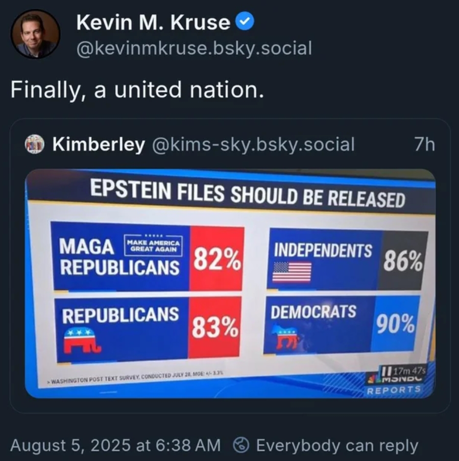 But if THAT is the case then you also believe that there is no way they would ever release the real documents--in fact, they would have already released some falsified version of them that only implicated dead people. Nobody would have made any mistakes, said anything to imply that other such documents existed, or for that matter asked any questions that indicated otherwise. So why would you "demand" that the files be released? Why do you think Epstein was arrested in the first place? Why would you make a political demand if you don't believe that politics is actually real?