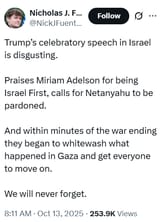 They didn't really win, unless you want to call it a pyrrhic victory. This is part of the reason they were willing to end the war, they had lost so much for pretty much no gain. Trump helped push it further by touring Arabia and getting all those guys in on a plan for Gaza. Since Netanyahu is part of a more nationalist party, this all is probably hurting him politically. Thus, part of the agreement is likely for Trump to say that he is valuing his country by making peace. Ultimately though, everyone over there will win once that giant trade route is finished. Warhawks everywhere are the true losers as their Middle Eastern playground is wrapping up as the conflicts die down. The "war on terror" chapter has finally ended.