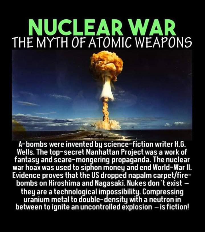 The 'nuclear bombs' story was invented in 1914 by 'New World Order' promoter and British elite Freemason H G Wells, who presented it in his novel, 'The World Set Free', Wells writing about fictional 'atomic bombs' dropped from aircraft that obliterate entire cities and lead to global war. It's all there, from H G Wells in 1914.