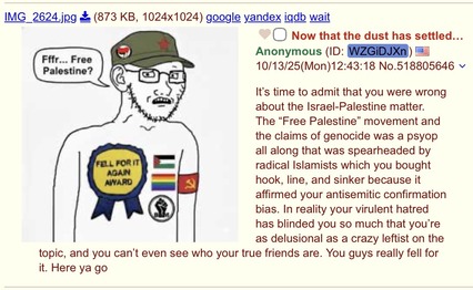 It’s time to admit that you were wrong about the Israel-Palestine matter. The “Free Palestine” movement and the claims of genocide was a psyop all along that was spearheaded by radical Islamists which you bought hook, line, and sinker because it affirmed your antisemitic confirmation bias. In reality your virulent hatred has blinded you so much that you’re as delusional as a crazy leftist on the topic, and you can’t even see who your true friends are. You guys really fell for it. Here ya go