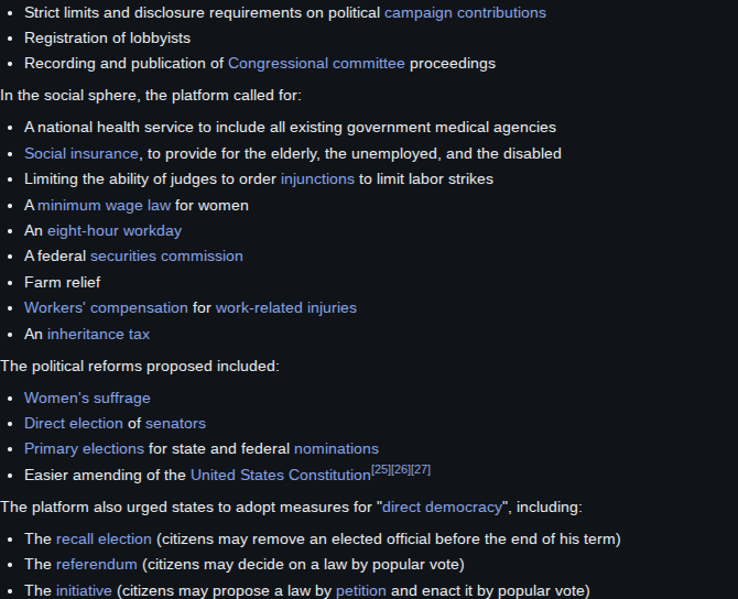 The progressive era was a conglomerate of social justice groups that came from all walks of life. Upper middle class liberal elites with a wide range of education and reading worked with Christian reformists on things like child labor laws, workers rights, etc. Unions also worked with these groups on shared goals. Teddy, FDR, etc. were all part of that. What made Teddy so unique was how he was initially much more right wing when he first entered into politics, but as time went on, he became corporate America's worst enemy. He broke up the trusts and monopolies left and right, and the business elite hated him for it. But he didn't come to those conclusions overnight, he just read daily. He read a book a day, made it a point to go outside regularly, he was adventurous, and he was a war hero. He was one of the last presidents to lead men directly into combat. Teddy had balls bigger than the entire Pentagon combined.