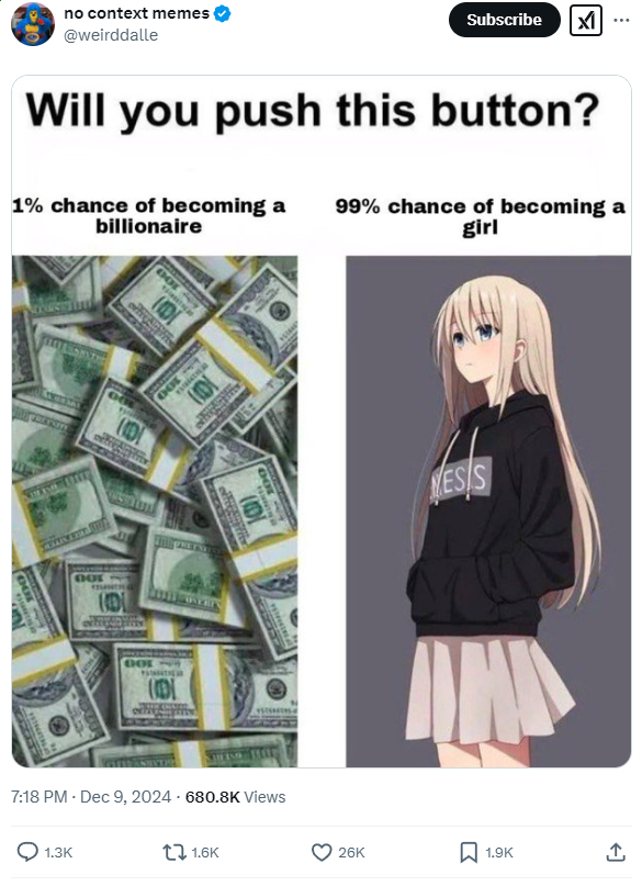 Ngl being a girl seems like a shitty life but 1% chance at $1,000,000,000 is huge.