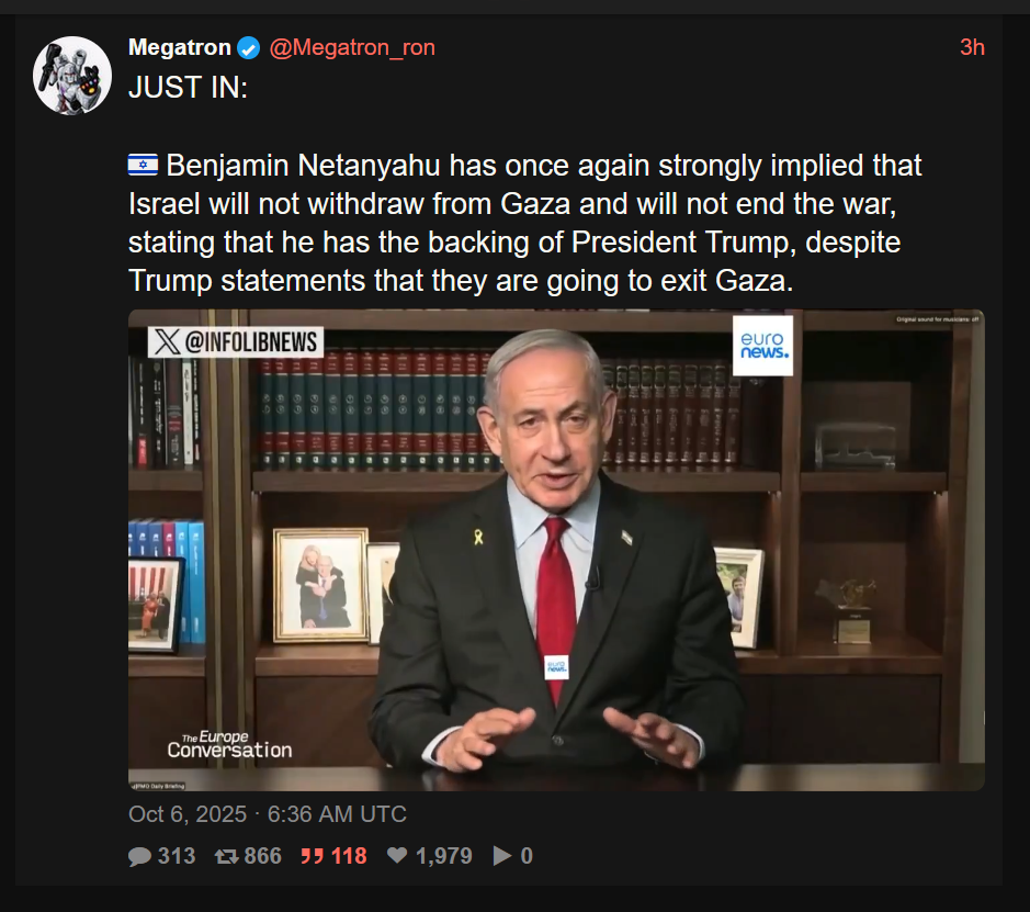 Every time there is the slightest compromise in the name of peace, Bibi gets on air to the Israeli people afterwards and tells them "Yeah I just lied and said that to get them off our back", as if no one can translate Hebrew