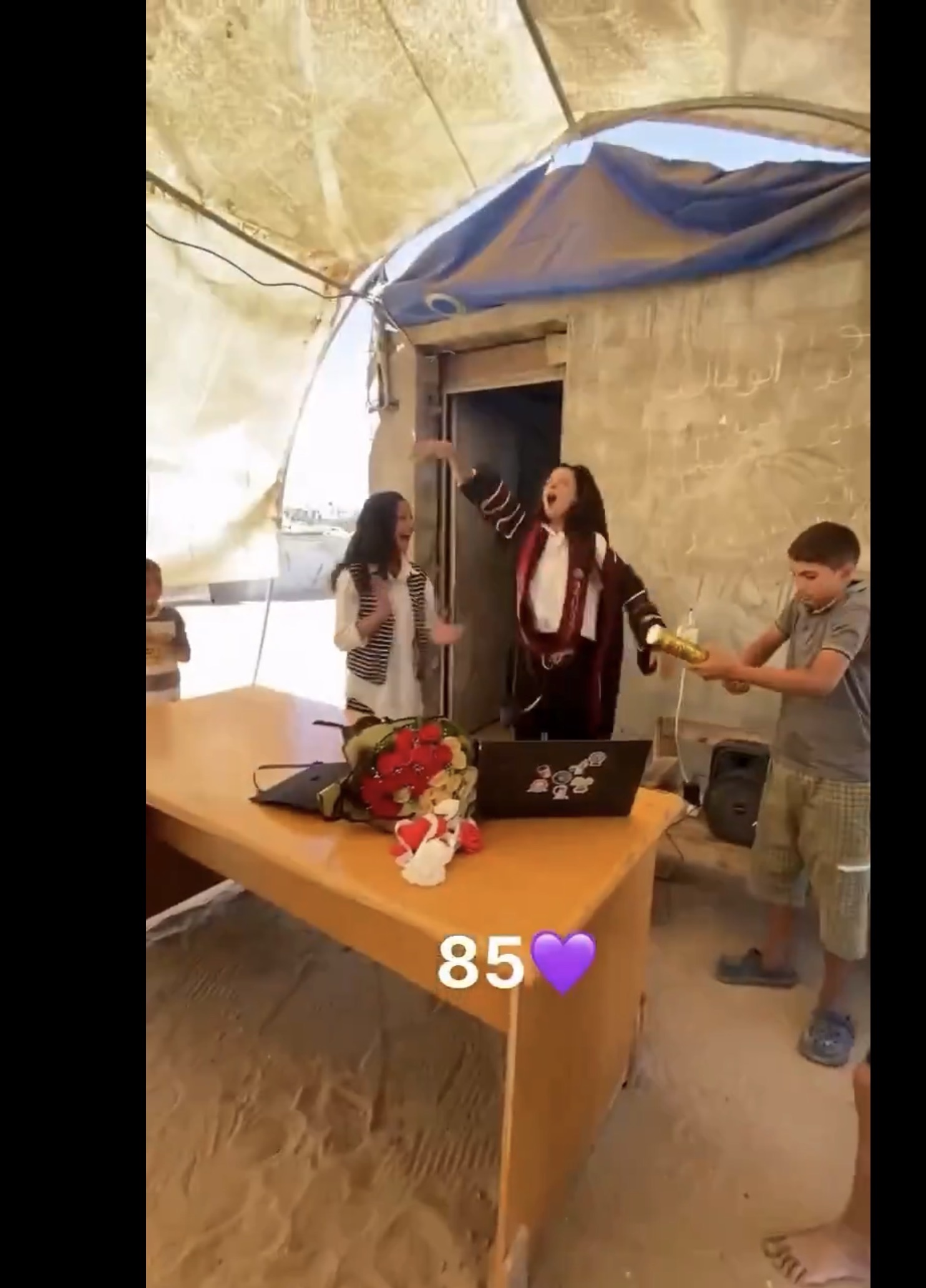 A high school student in Gaza celebrates her achievement on exams, after two years of war, displacement, and the absence of basic living conditions