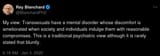 I dont want to grow my jaw, grow my muscles, getting that forhead slope. no! Leave me as I am. i'm not gonna develop in this direction and I dont want to! so I will take the action which will prevent the fulfillment of male development and that is taking estrogen. and that is basically what a tranny is. someone who takes cross sex hormones and is more comfortable in a female role l, whether it be in dress or sex.