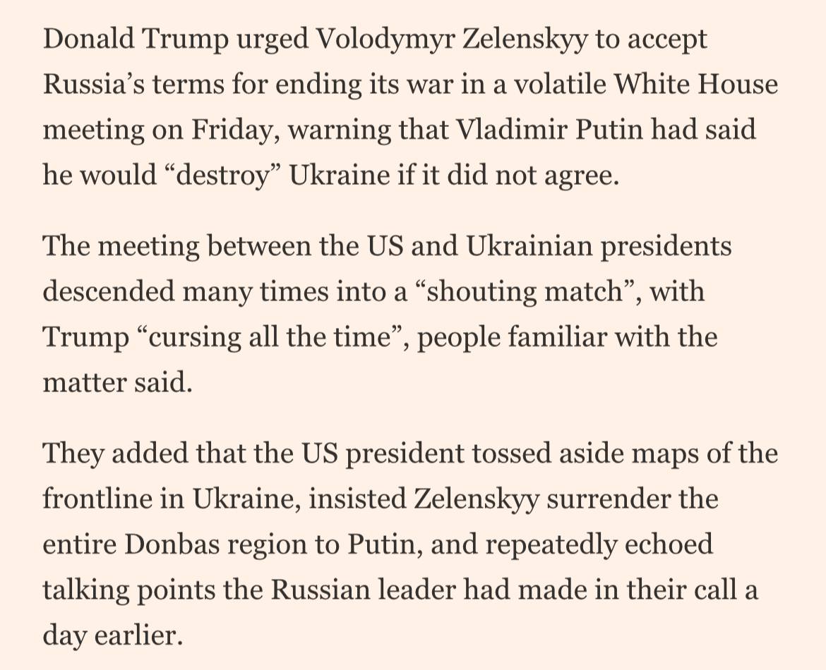Trump understands everything. That's why he is in hurry. He can't allow Ukrainian collapse, but he doesn't want to keep wasting US resources either, because he needs it in other places. The peace deal is his own way to get away. But giving too much to Russia would put him in a rough spot in the US and strengthen Russia both which he doesn't want.