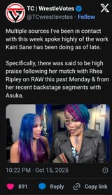 (The Captain has put on banger after banger this past week at Crown Jewel, Raw, Melbourne Supershow, and will be sure to once again win the hearts of the crowd in her homeland of Japan. We can all be proud of Kairi for coming so far from those days when it seemed she would be stuck in tag prison with Asuka forever.