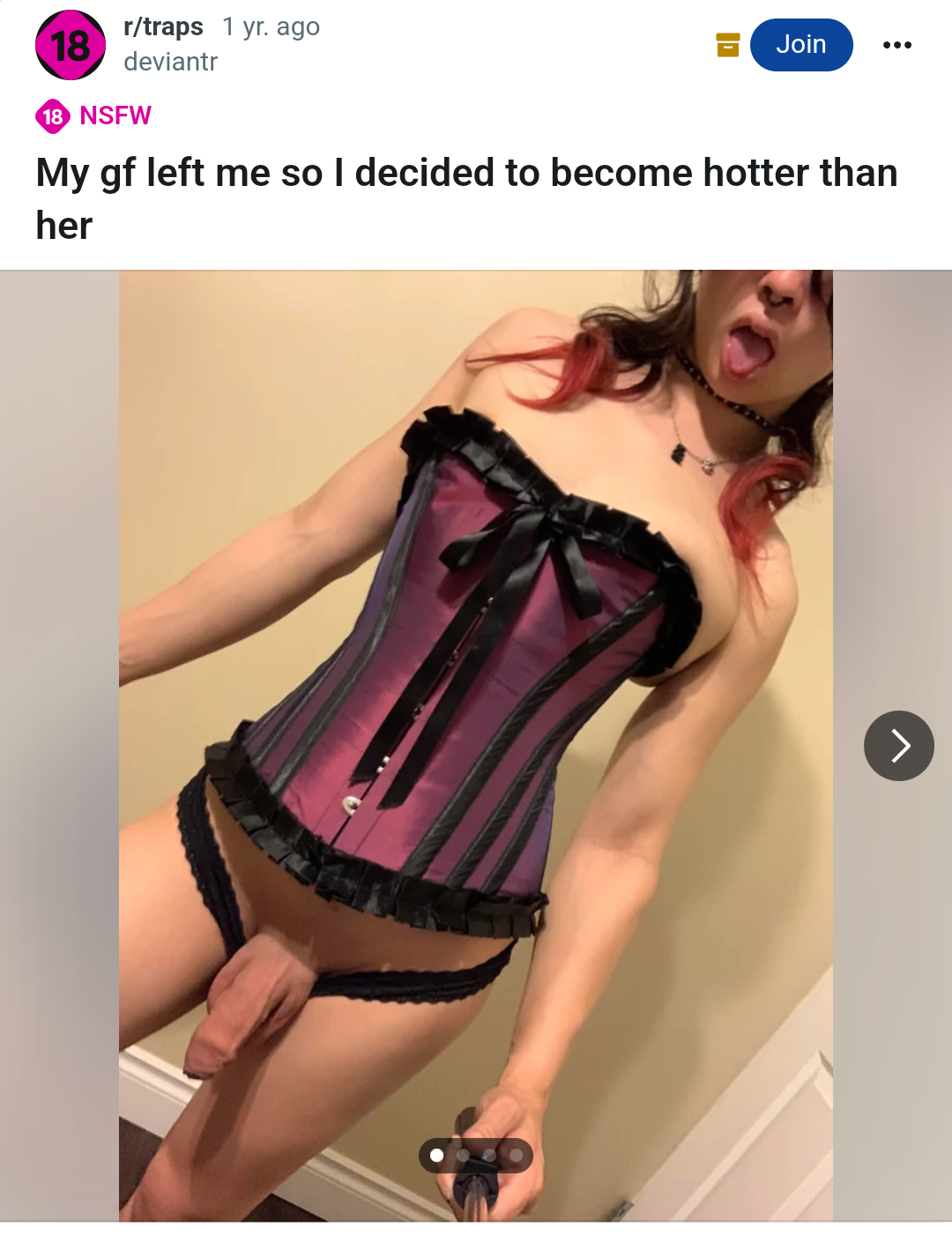 A lot of these guys would be more attractive if they didn't crossdress and just continued to present as regular guys with long hair, this guy has a big cock and a good figure but the corset and the stupid tongue-out face troons love making in photos ruin it
