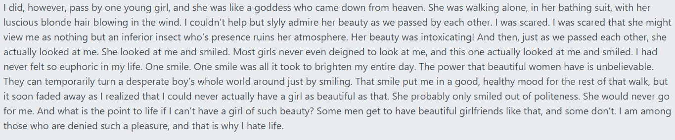 Your ER derangement syndrome is quite wild, amico. I never said that I worshipped Elliot Rodger, and I don't find sympathy to be a negative quality.