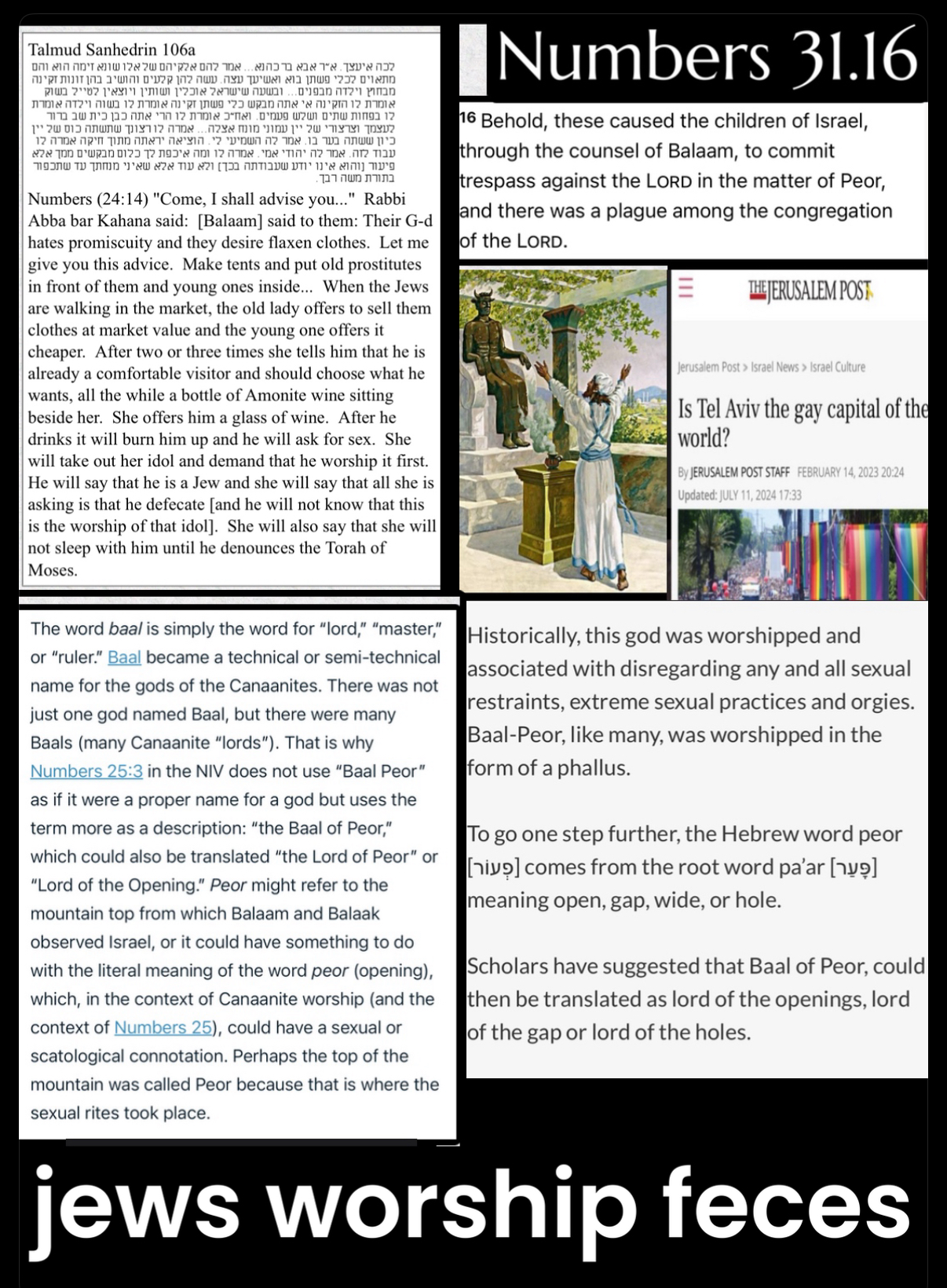 The lgbt community’s need to normalize sexual degeneracy bullshit is equivalent to Baal peor worship essentially . The talmud instructs humans on how to worship Baal-peor. (Talmud Sanhedrin 106a) suggests how jewish women would woo Jewish men with prostitution and then have the Jewish man defecate on their idol of peor.