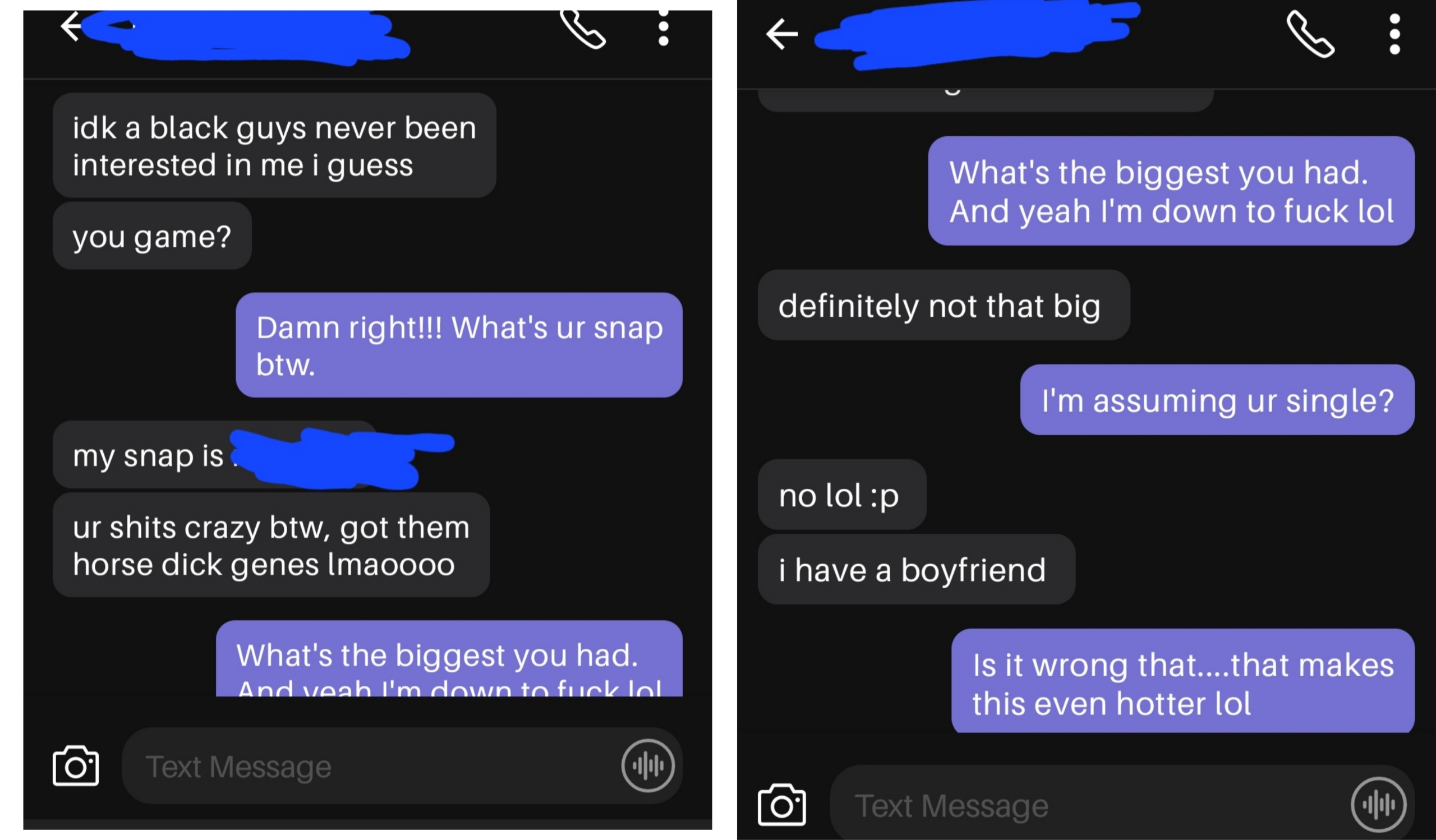 Doing bbc loyaty tests.Ever wonder how the women in your life would react to getting a "wrong number" Text of a massive pussy moisting bbc?I'm talking about one so big it instantly sets off cave women instincts to want it to breed her.I send your wife/gf or female relative or female friend a MASSIVE bbc and I'll screenshot her reactions. Kik elloco805 discretion guaranteed. No SOCIALS NO SOCIALS!!! TEXT ONLY TEXT ONLY!! US numbers only. Big tits get preference but all are welcome. NO FATTIES (thicc okay) NO1 over 45 or under 21. Pic related a recent failure FYI doesn't happen often but it does happen, more than you would expect. don't message me unless you have a girl to test...