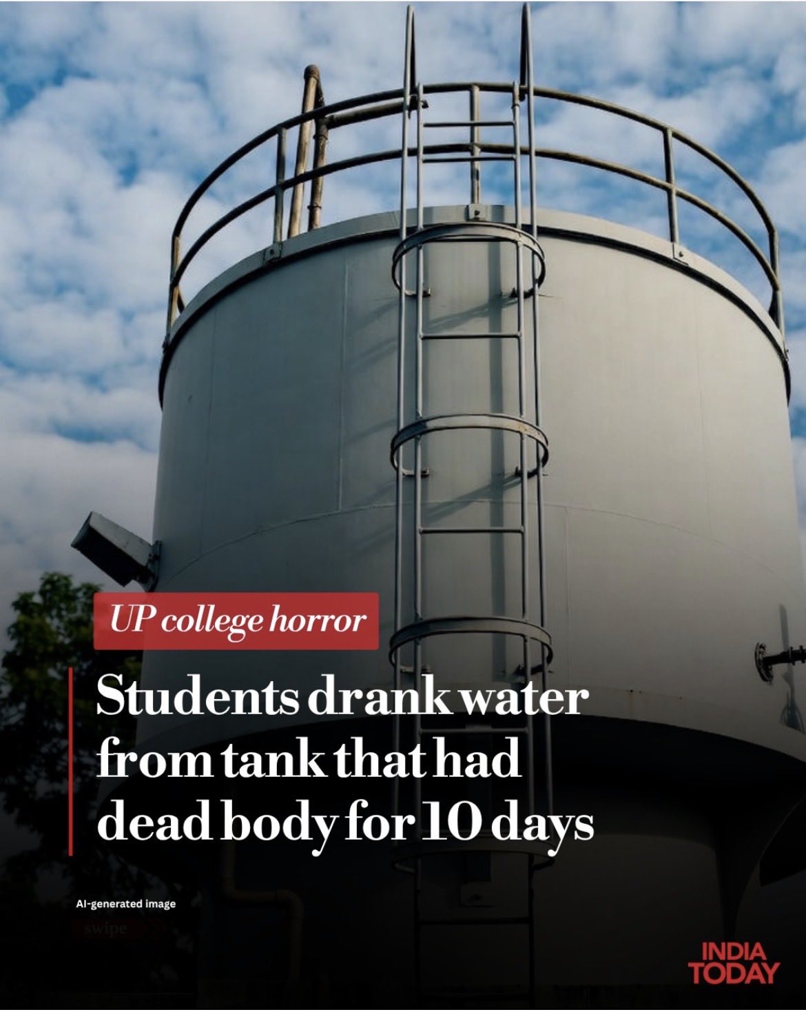 A decomposed body was found in a water tank at Maharshi Devaraha Baba Medical College in Deoria, Uttar Pradesh, on October 8, 2025. Students, staff, and patients had unknowingly consumed the contaminated water for about ten days, after which a foul odor prompted an investigation.