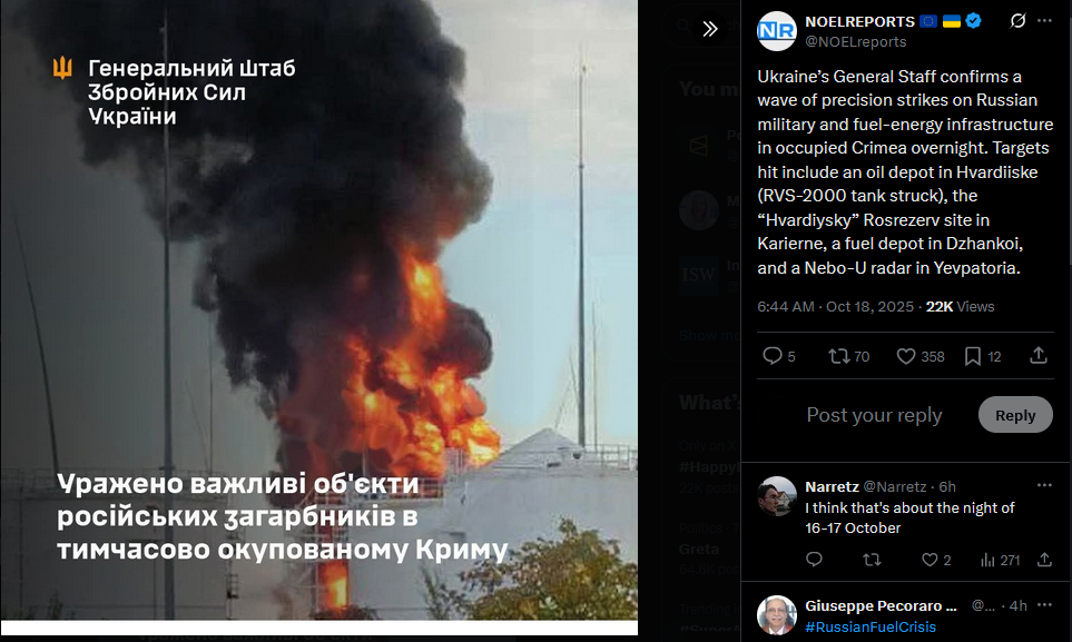 Ukraine’s General Staff confirms a wave of precision strikes on Russian military and fuel-energy infrastructure in occupied Crimea overnight. Targets hit include an oil depot in Hvardiiske (RVS-2000 tank struck), the “Hvardiysky” Rosrezerv site in Karierne, a fuel depot in Dzhankoi, and a Nebo-U radar in Yevpatoria.
