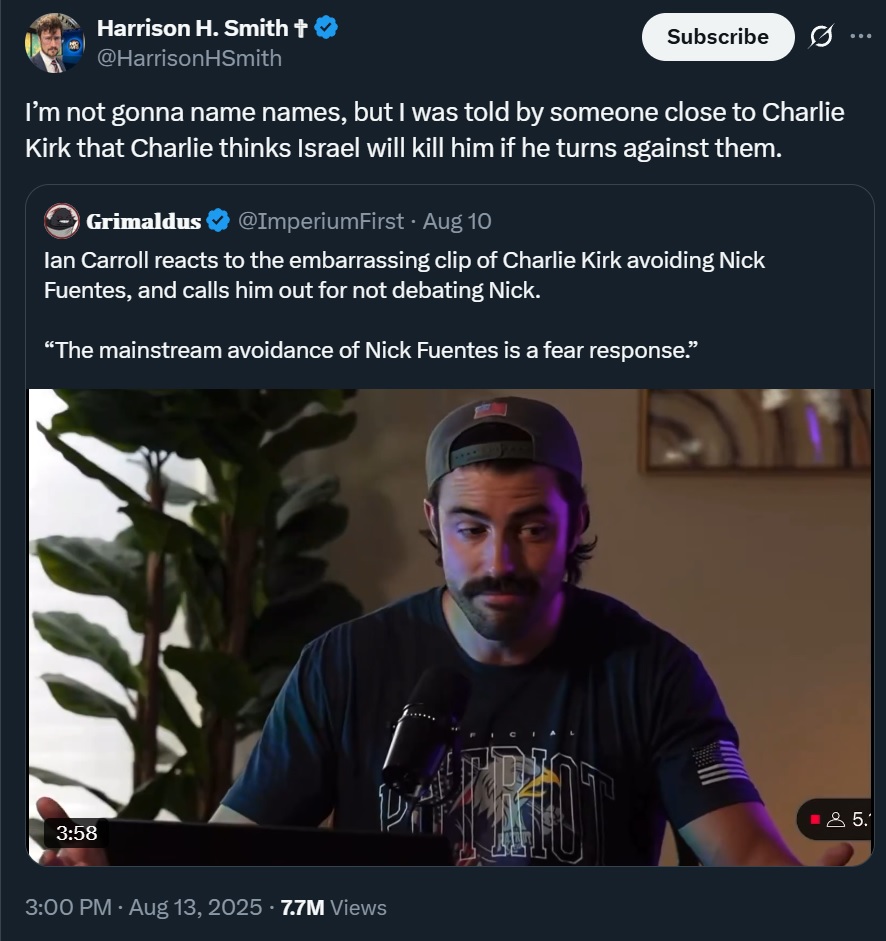 Charlie Kirk, friend of Isreal, was assassinated while Nick Fuentes, critic of Israel, lives.