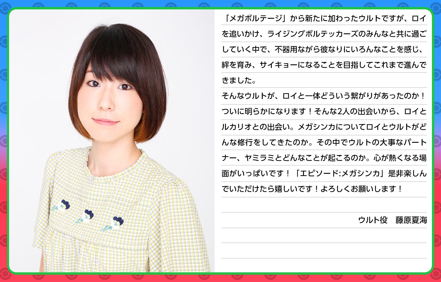 >Today is finally the premiere of three weeks in a row of Pokémon anime Mega specials! As such, we've received a comment from Uruto's voice actress Natsumi Fujiwara-san: