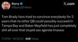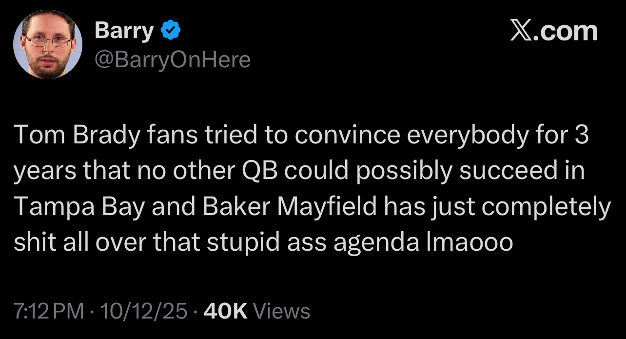 Bradyfags will, and have even here in /nfl/, assert the opposite. I've seen them claim that the Buccs were a complete dumpster fire that Brady turned around all by himself with no help from anybody.
