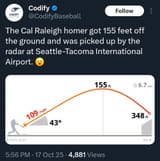 >Cal Raleighs hr flew further than the Voyager spacecraft to become the furthest man made object from Earth.