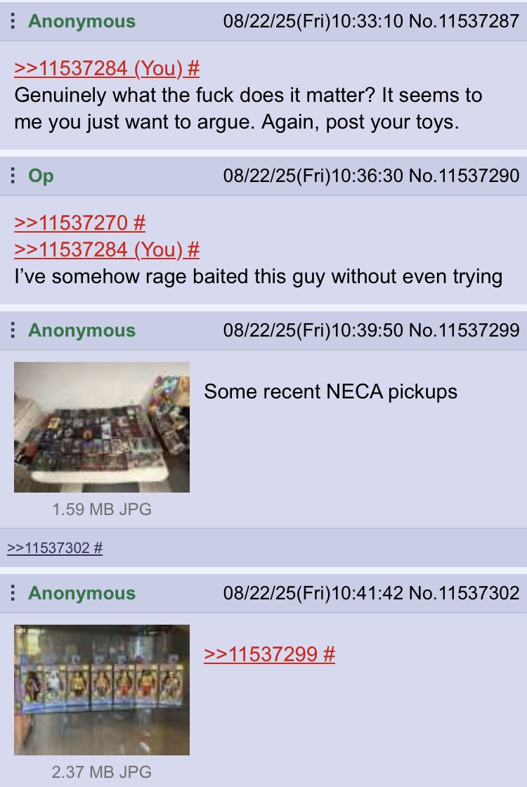 People wonder why /toy/ feels like a ghost town lately and this thread is the perfect example as of why. Guy just wanted people to post recent pickups and immediately it turns into shitposting. Genuinely embarrassing.